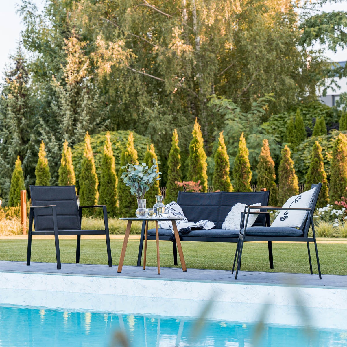 Priuštite si kvalitetan i moderan četverodijelni vrtni set ABER, koji će oživjeti vašu terasu ili vrt. Vrtni set obogatit će vaš prostor i omogućiti vam da se družite sa svojim najmilijima u ugodnim toplim večerima. Za udobnost brinu jastuci, za sigurnost metalni okvir, a za izgled ukrasne slike na foteljama.