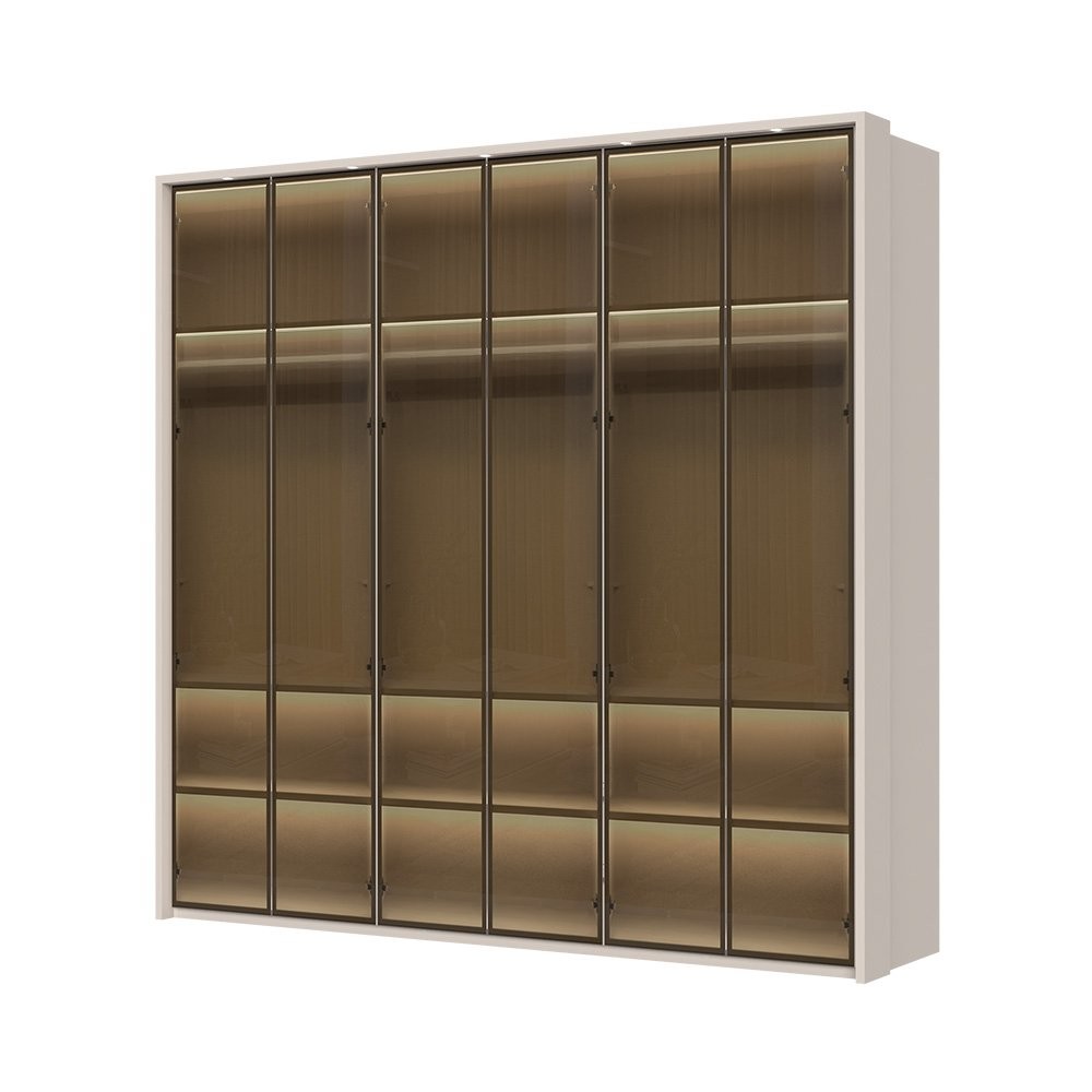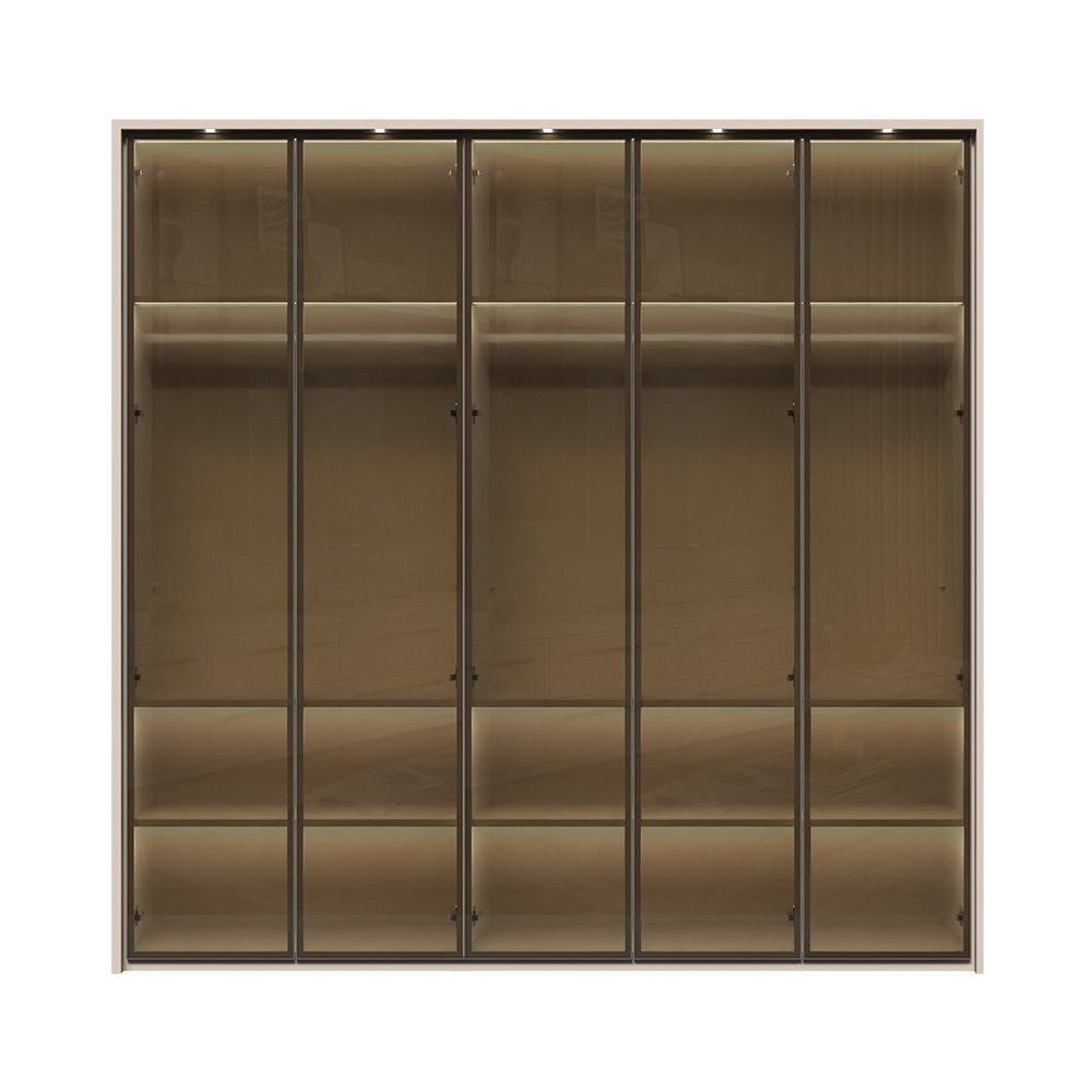 5-delna garderobna omara Kalla Opera P5B-5AL je odlična izbira za vse, ki si želijo prostorne in elegantne rešitve za shranjevanje oblačil. S svojimi steklenimi frontami in aluminijastim okvirjem prinaša sodoben in prefinjen videz v vaš dom. Njena notranjost v videzu tekstila dodaja pridih luksuza, medtem ko mehko zapiranje zagotavlja tiho in udobno uporabo.