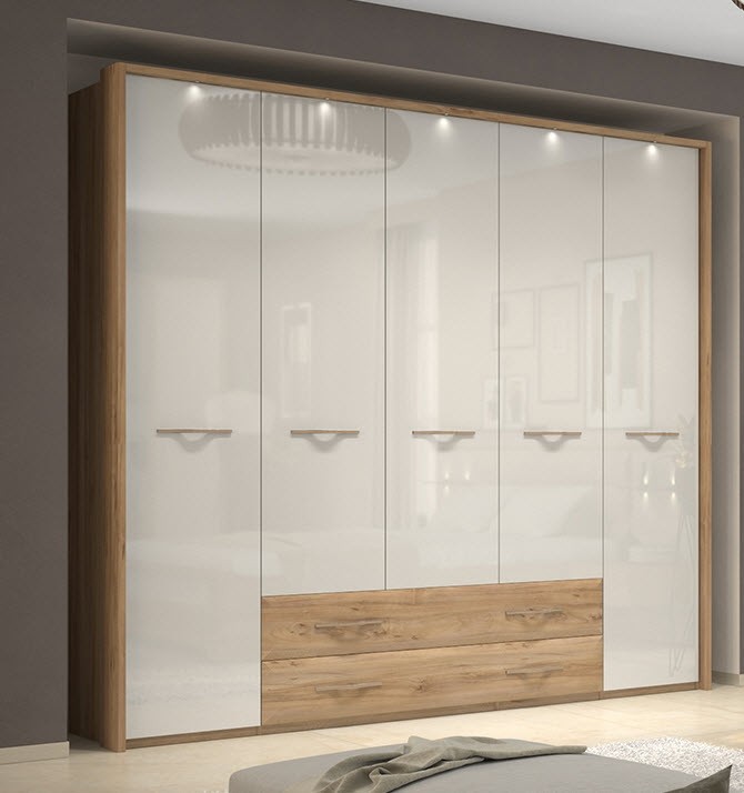 Elegantan 5-djelni garderobni ormar KALLA GALA uključuje rasvjetu i dekorativni okvir, koji još dodatno uljepša ormar i stvori ga elegantnijim. U donjem djelu nalaze dvije ladice, a iza 5 vrata krije se 8 polica te 4 šipke za vješanje, stoga možete u ormar spremiti puno odjeće i modnih dodataka te jih ujedno i organizirati, tako da ćete uvijek znati gdje šta tražiti. Ladice i vrata sadrže funkciju tihog zatvaranja, za lakšu upotrebu te dugotrajnost ormara. Vanjski djelovi ormara premazani su UV lakom, koji ćini ormar otpornijim na vlagu, ogrebotine te oštećenja, stoga ćete ormar koristiti još niz godina!