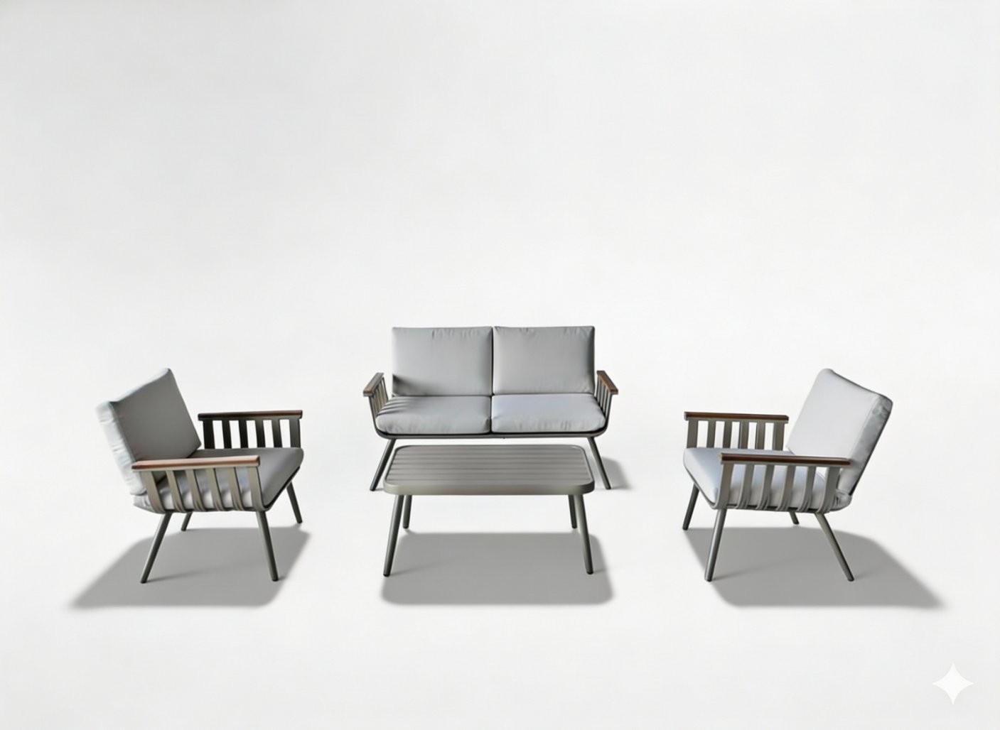 Dobro se uklapa u prostore kao što su balkon, terasa i vrt. Među navedenim dimenzijama ističu se 142 × 76 × 73 cm i 68 × 76 × 73 cm. Komplet oziroma izvedba uključuje 2 fotelja, kavč, stol. Praktičnost dodatno naglašavaju uključeni jastuci.