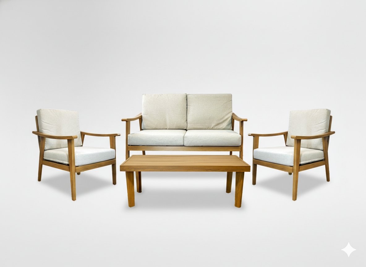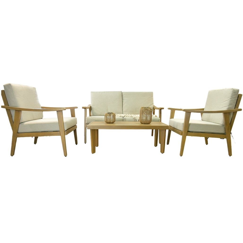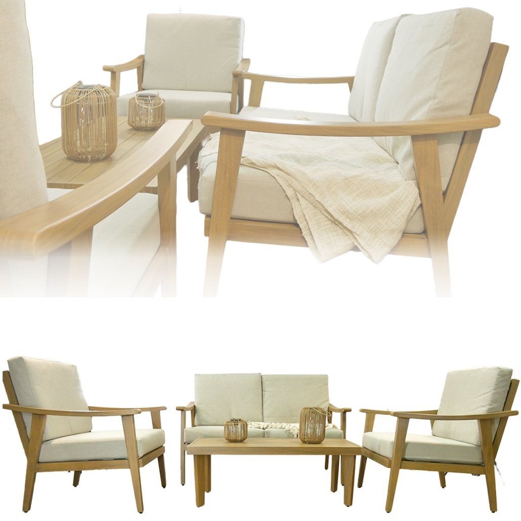 Aluminijski vrtni set Tirana (bež) je sodoben lounge komplet za teraso, vrt ili prostor za sprostitev. Bež barva kompleta i blazin deluje svetlo i umirjeno, ogrodje u videzu lesa pa doda topel poudarek.