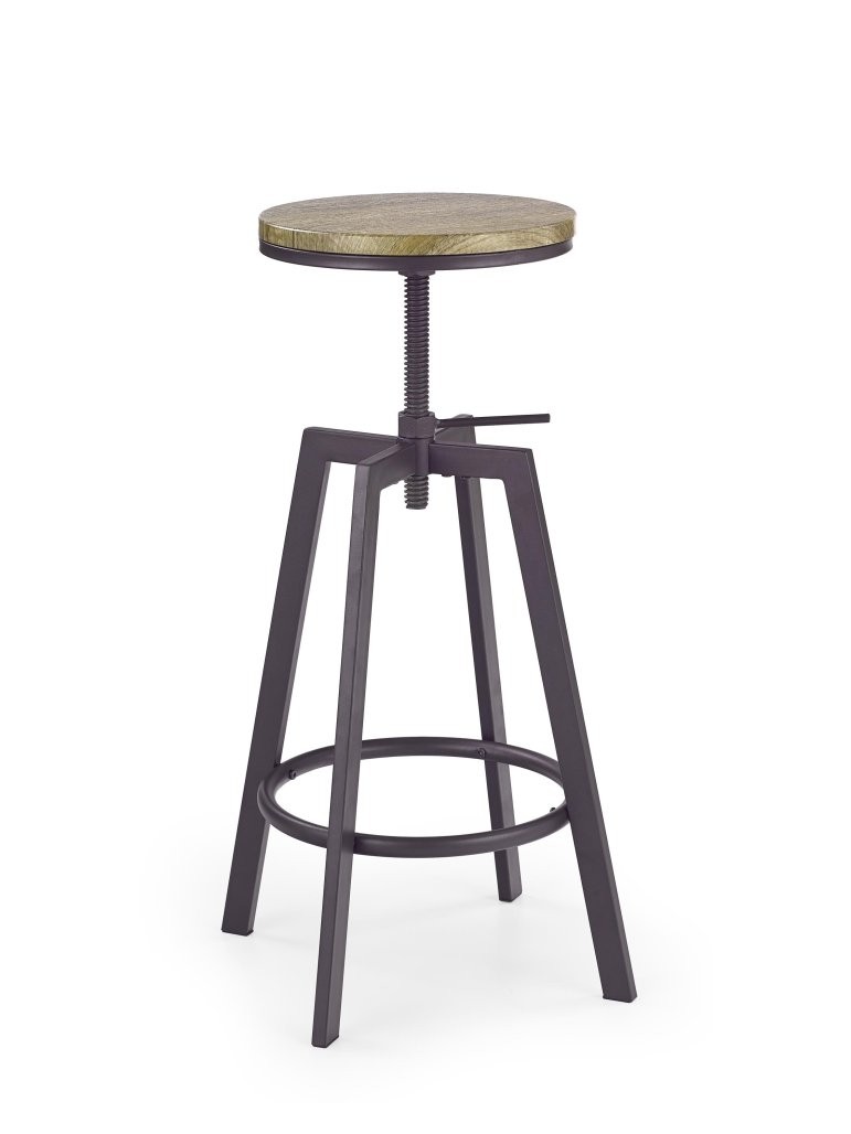 Barski stol Aslan u rustikalnom industrijski stilu ima sjedište od laminiranog MDF-a u nijansi kave i crne metalne noge. S podesivom visinom od 63 do 80 cm, odličan je dodatak industrijskom i vintage interijeru.