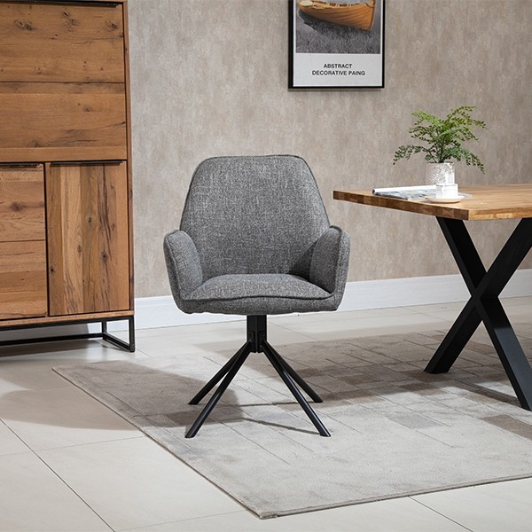 BLAGOVAONSKA STOLICA ANDRE moderna je stolica za blagovanje s tapeciranim naslonom i sjedalom koja nudi maksimalnu udobnost tijekom sjedenja. Kvalitetna tkanina u univerzalnim bojama i elegantni nasloni za ruke zasigurno će uljepšati svaku blagovaonicu. Baza je metalna i prahom presvučena crnom bojom, a stolica se također može okretati.