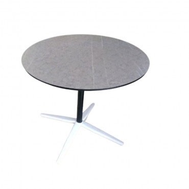 Blagovaonski stol BARCA okruglog oblika i modernog izgleda. Jednostavan stol koji je prvenstveno namijenjen manjim blagovaonicama, jer ne zauzima puno prostora, a svojim oblikom ga također možete smjestiti u tako mali prostor. Promjer ploče stola je 80 cm i ima uzorak od sivog mramora. Stol je oslonjen na noseći stup od metala. Stup je također praškasto lakiran crnom bojom. Noge su lakirane u bijelu boju. Maksimalna nosivost je 50 kg.