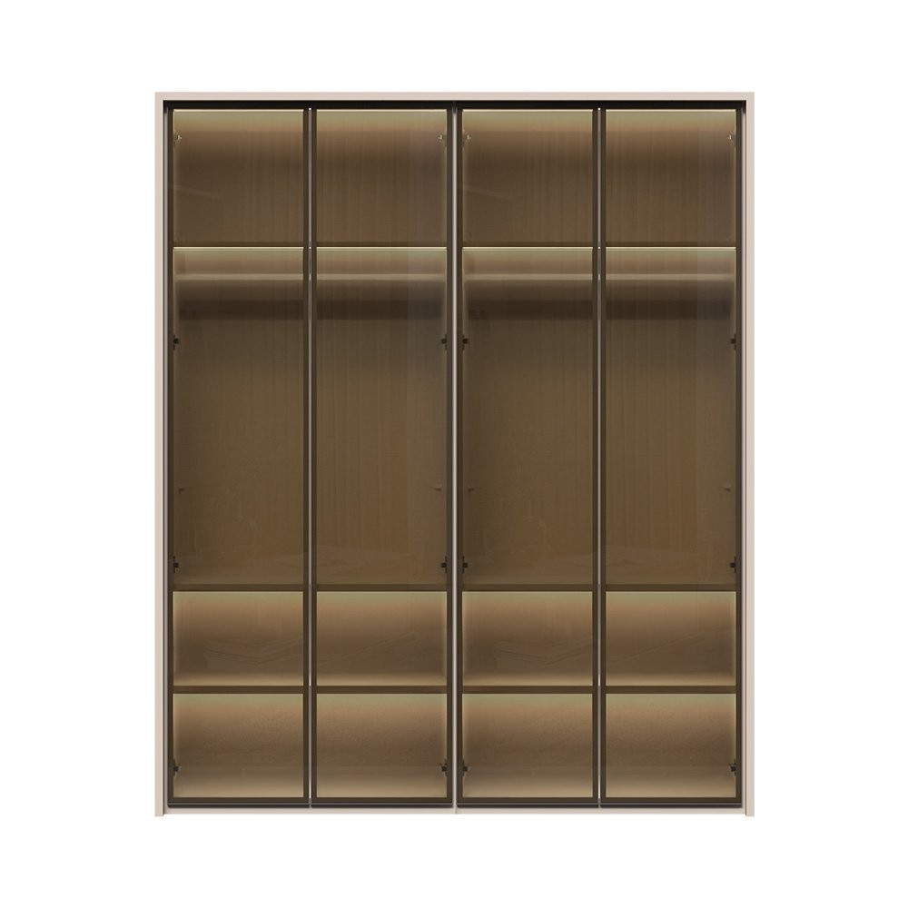 4-delna garderobna omara Kalla Opera P4A-4AL je odlična izbira za vse, ki si želijo elegantne in funkcionalne rešitve za shranjevanje oblačil. S svojim modernim dizajnom, steklenimi frontami in aluminijastim okvirjem prinaša prefinjen videz v vsak prostor. Površina korpusa je lakirana s soft mat UV lakom v barvi kašmir, kar zagotavlja trpežnost in estetsko dovršenost.