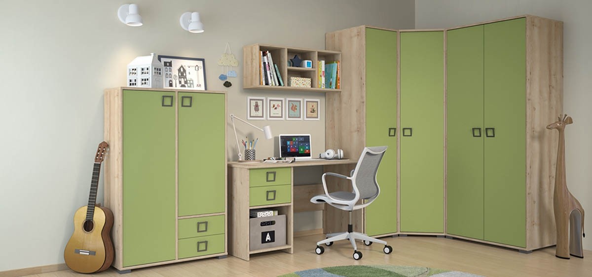 Dječja soba KIKI 3 je iznimno prostrana dječja soba, koja se sastoji od šest različitih elemenata. Tri garderobna ormara će vašem djetetu nuditi i više nego dovoljno prostora za pohranu i dobru organizaciju odjeće, posteljine te raznih modnih dodataka. Prostor iznad stola je maksimlano izkorišten sa visećom policom, koja će se zajedno sa ladičarima ispod stola, pobrinuti da će radni prostor stola uvijek biti uredno pospremljen i organiziran. Komoda nudi dodatan prostor za pohranu različitih igračaka, školskog pribora te ostalih predmeta po želji.
