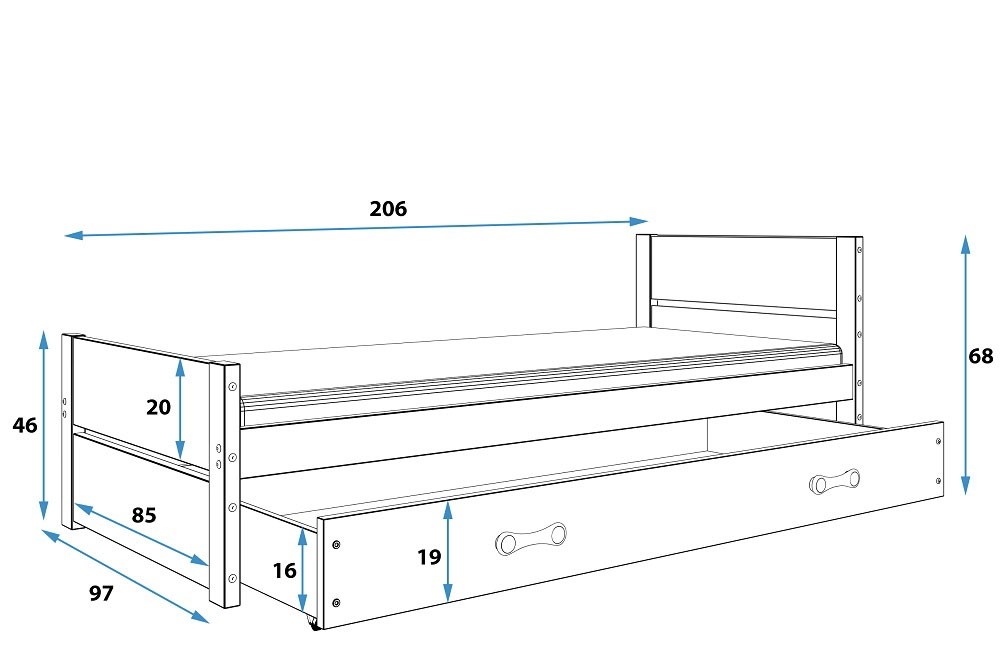 Praktičan i moderan krevet BARTEK sve je što vaše dijete treba. Krevet nudi udoban prostor za spavanje i veliku ladicu ispod kreveta koja će omogućiti uredan prostor i spremljene igračke. Krevet je dostupan u prekrasnoj boji grafita koja savršeno pristaje uz svaku dječju sobu. Ležište i podnica su uključeni u cijenu.