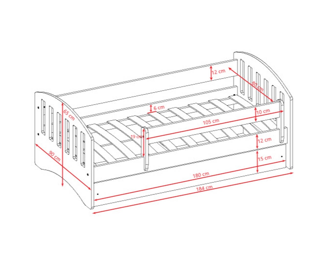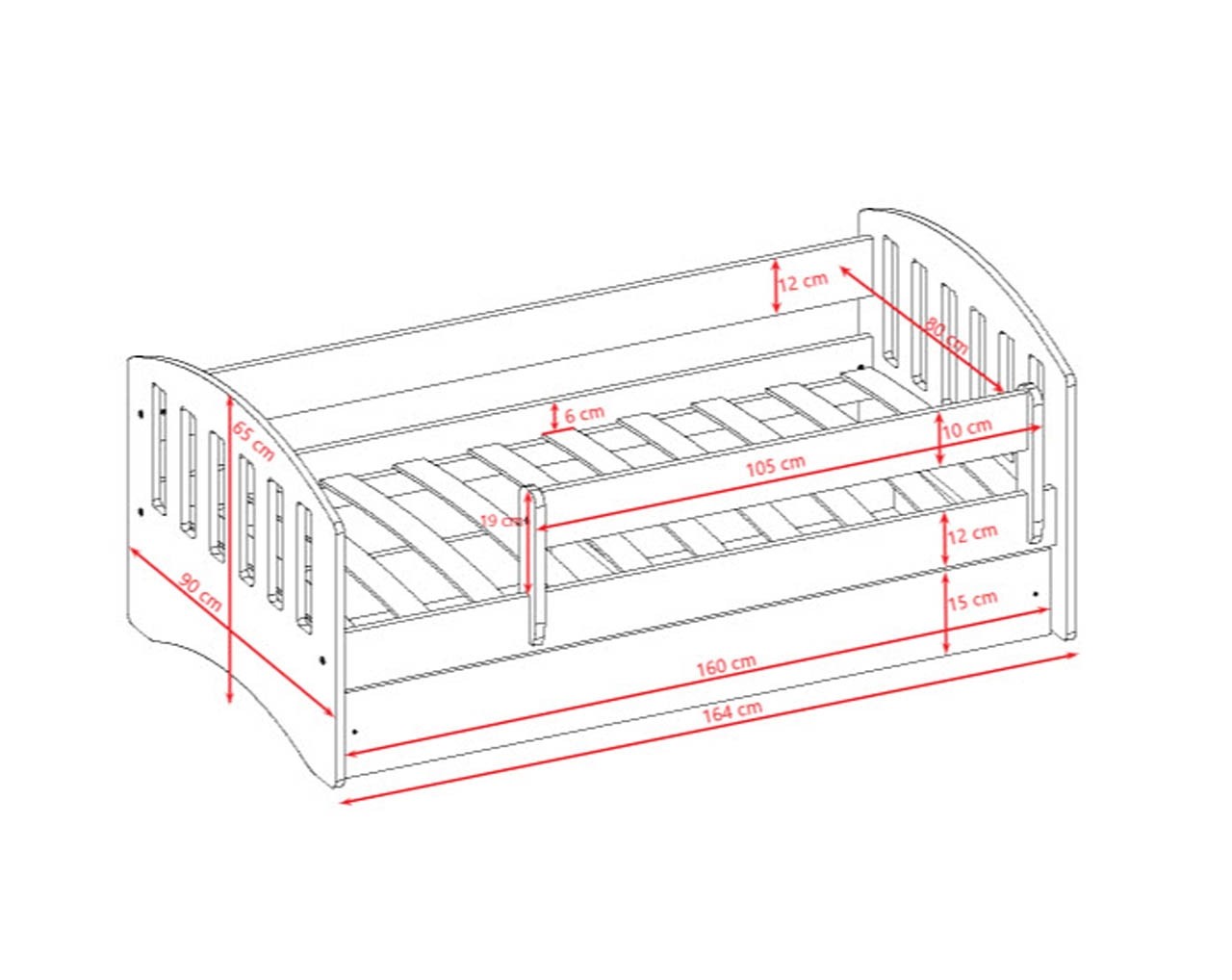 Pokretna ograda duga 100 cm osigurava sigurnost vašeg djeteta tijekom sna, tako da više nikada nećete morati brinuti. U ladicu ispod kreveta možete spremiti posteljinu, jastuke, deke i sve ostale stvari koje zauzimaju puno mjesta u ormaru. Maksimalna nosivost kreveta je 100 kg, pa je pogodan i za stariju djecu.