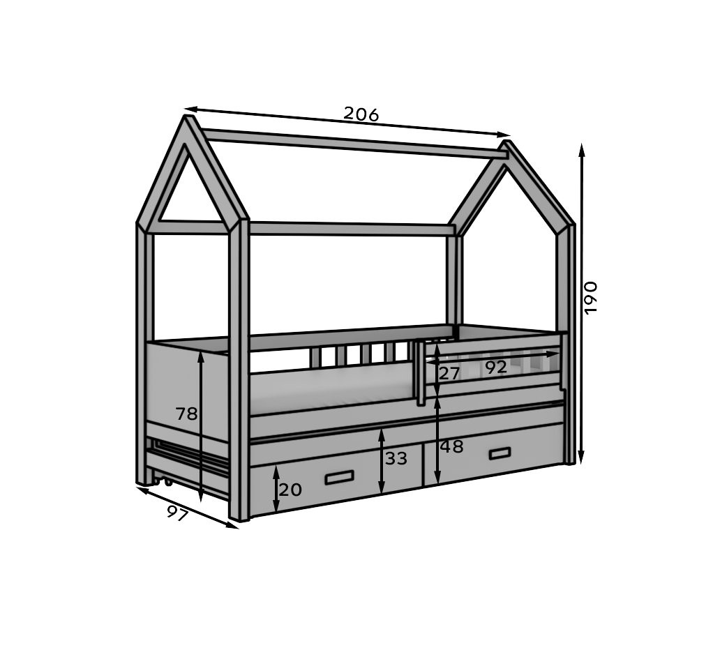 Dječji krevet Kućica Jaspis s madracem savršen je izbor za roditelje koji žele spoj funkcionalnosti, estetike i udobnosti u dječjoj sobi. Ovaj dvoslojni krevet s dodatnim izvlačnim ležajem i prostranim ladicama omogućuje višestruku upotrebu i urednost prostora.