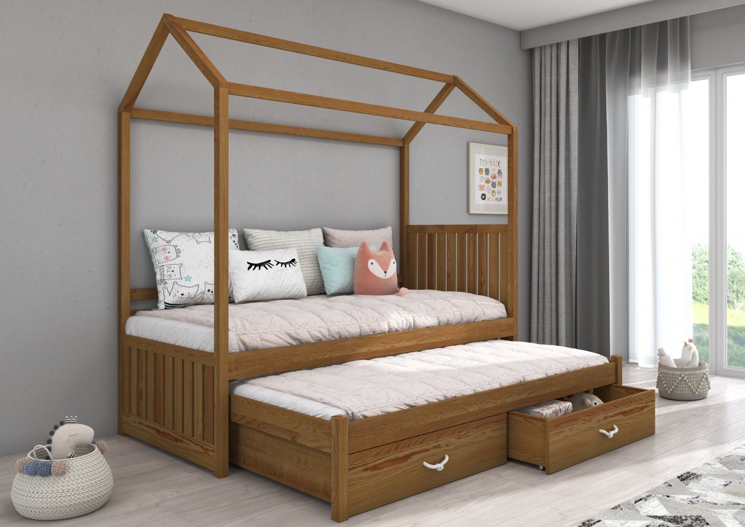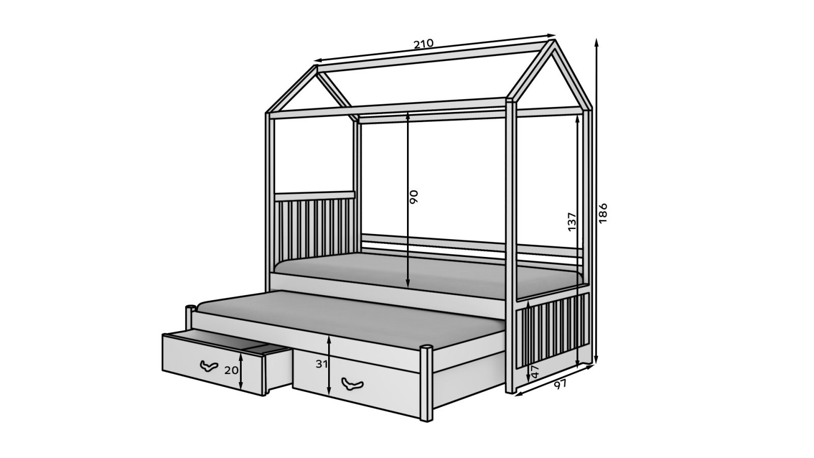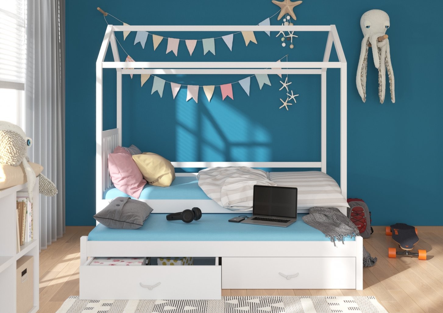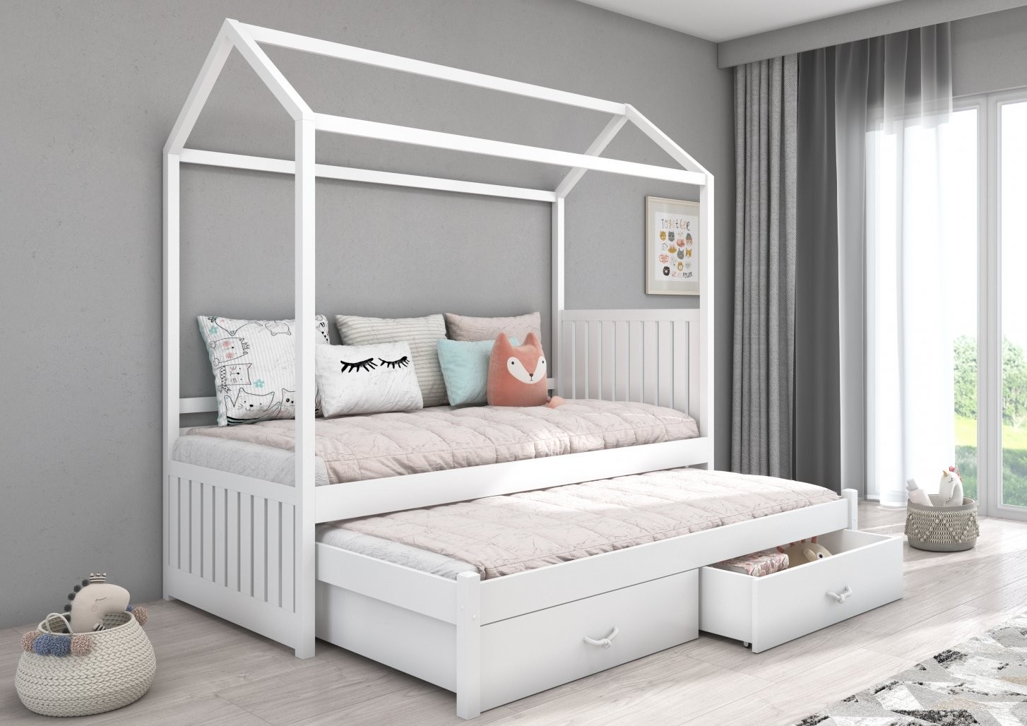 Dječji krevet JONASZEK u obliku simpatične kućice savršen je izbor za dječje sobe. Dizajniran za dvoje djece ili goste, s dodatnim ležajem i dvije prostrane ladice za posteljinu.