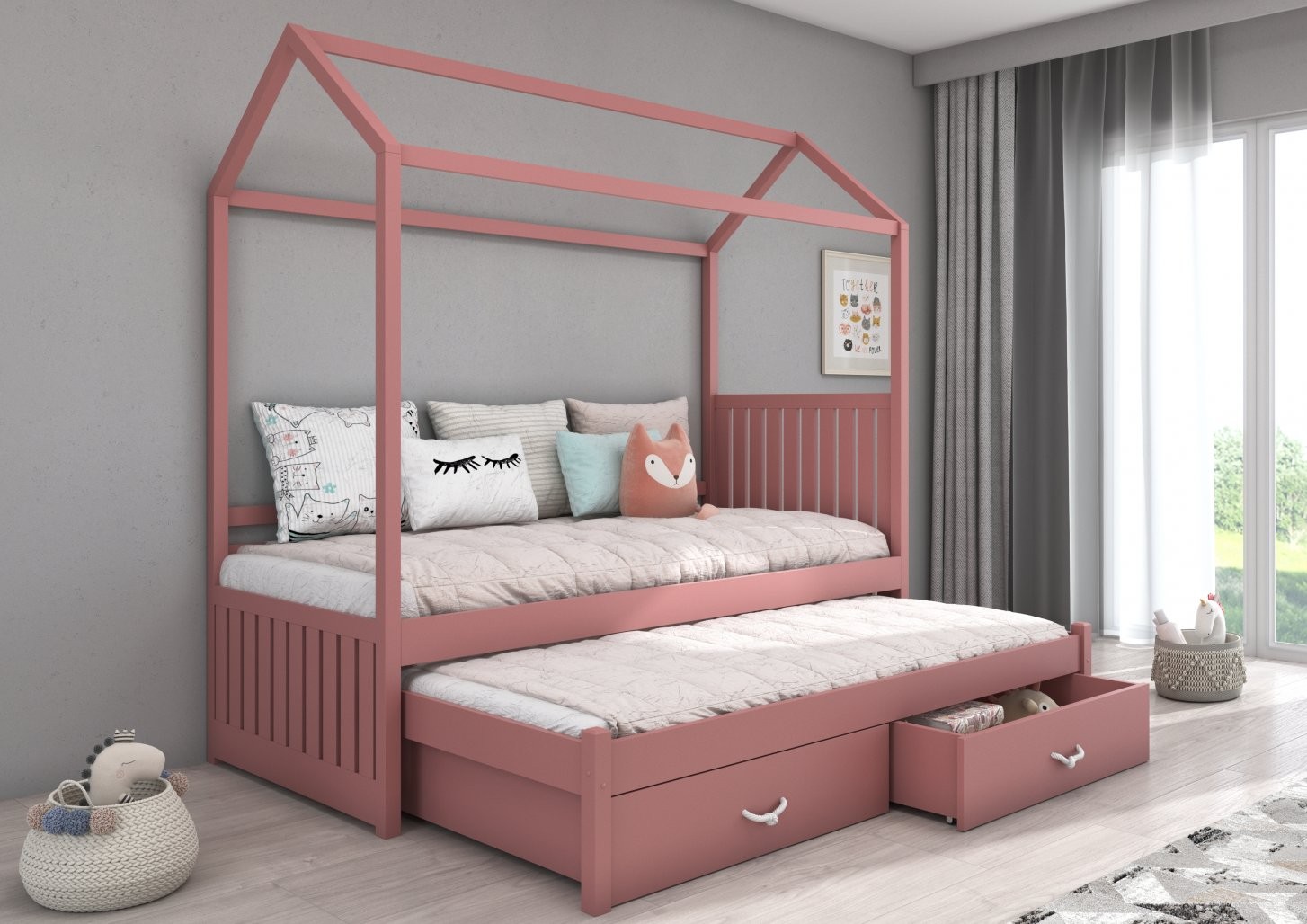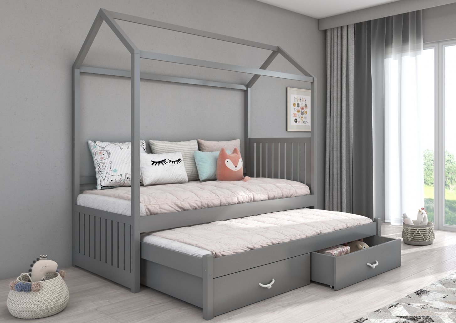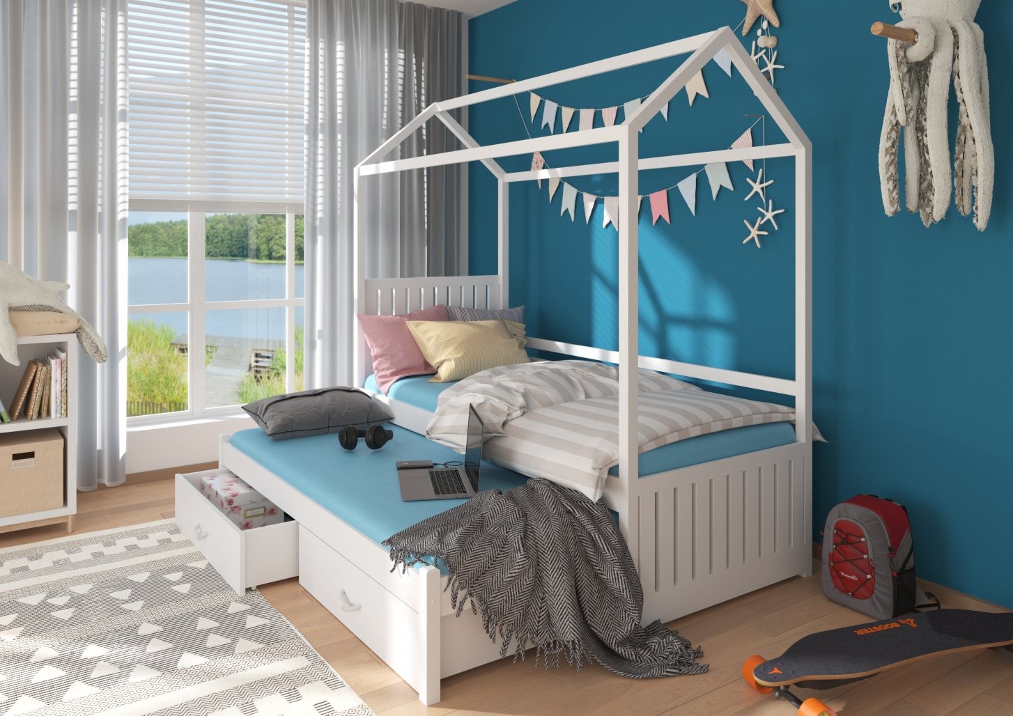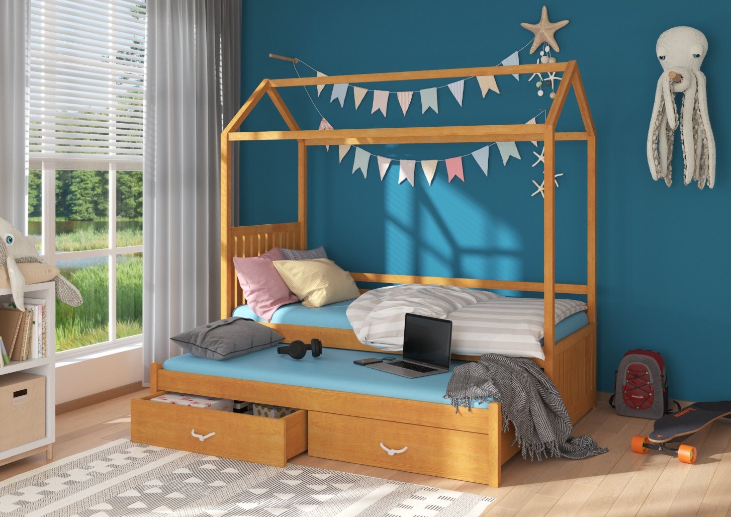 Dječji krevet JONASZEK u obliku simpatične kućice savršen je izbor za dječje sobe. Dizajniran za dvoje djece ili goste, s dodatnim ležajem i dvije prostrane ladice za posteljinu.
