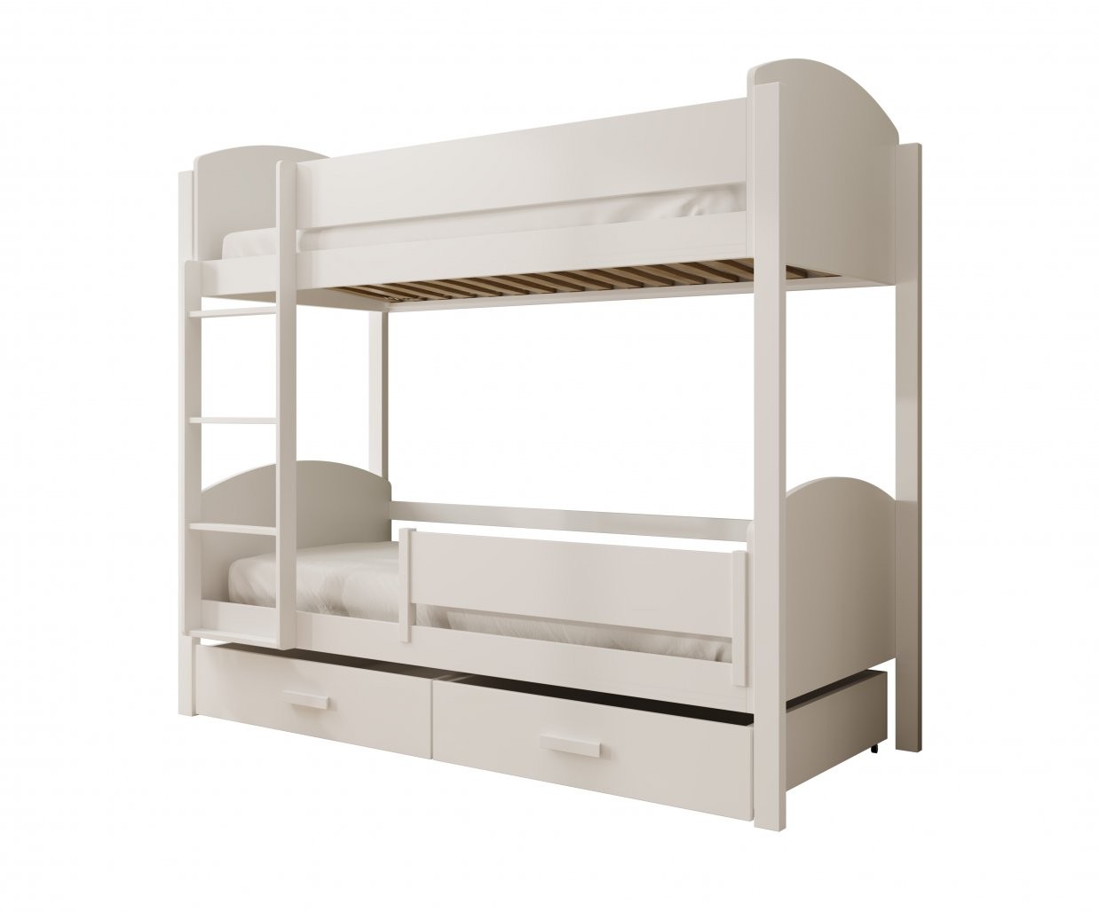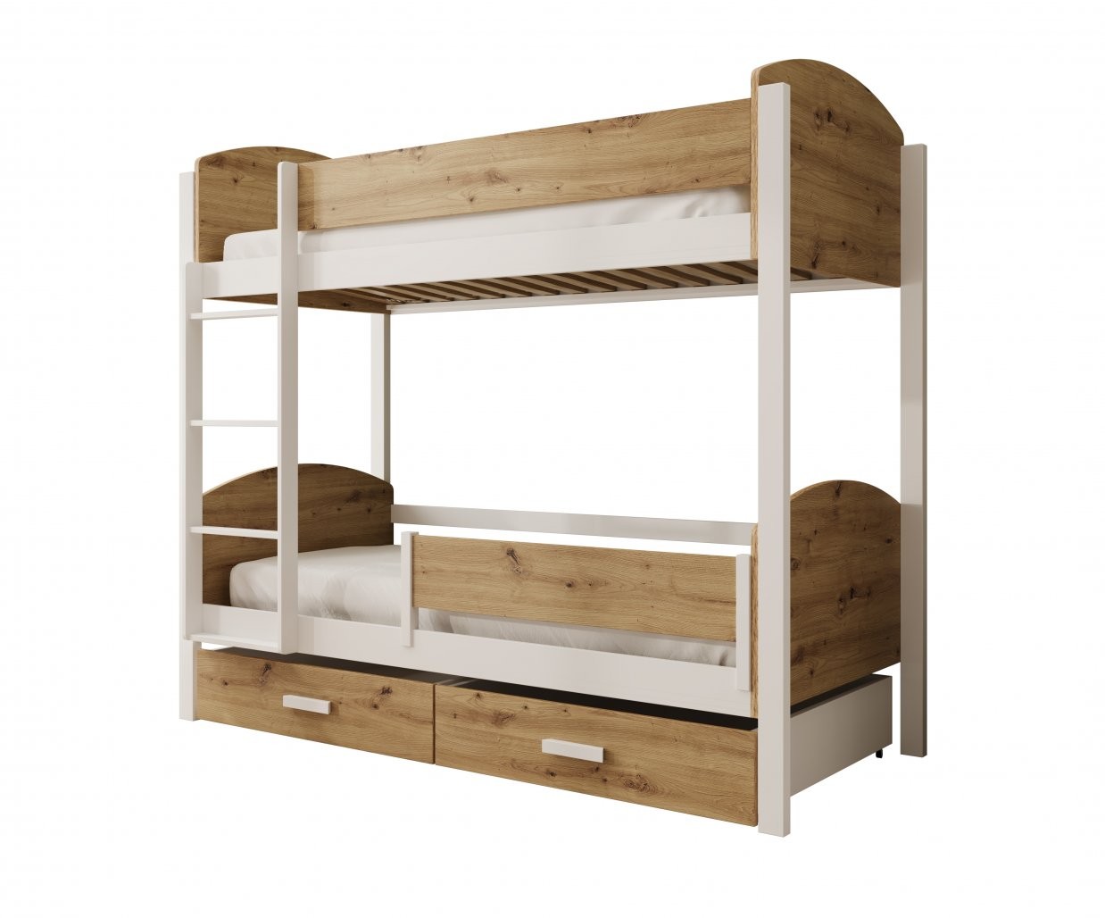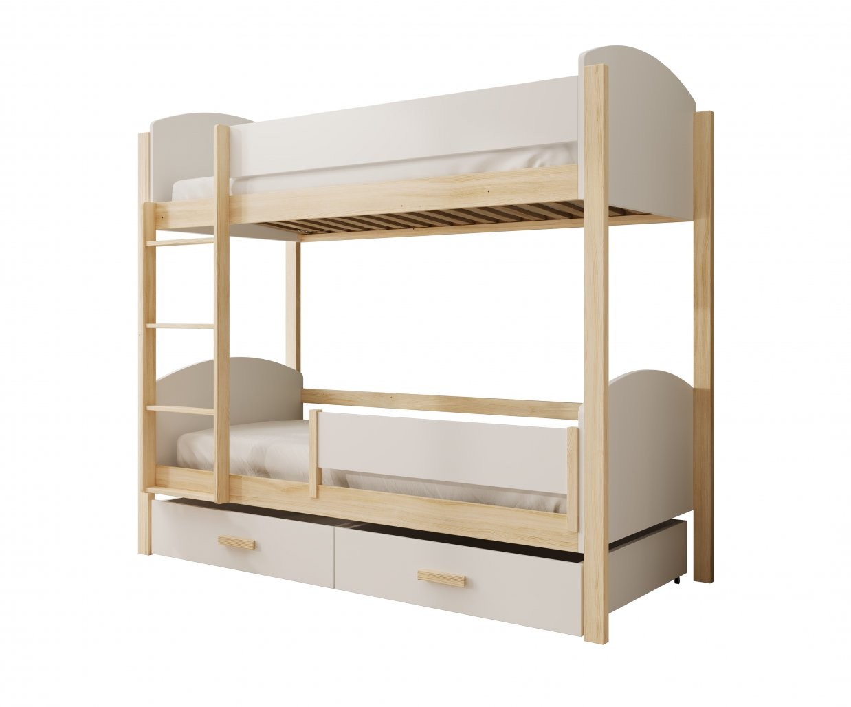 Dječji krevet na kat Jori s ogradom i madracem 180x80 nudi sigurnost, udobnost i prostor za pohranu – idealan za svaku dječju sobu.