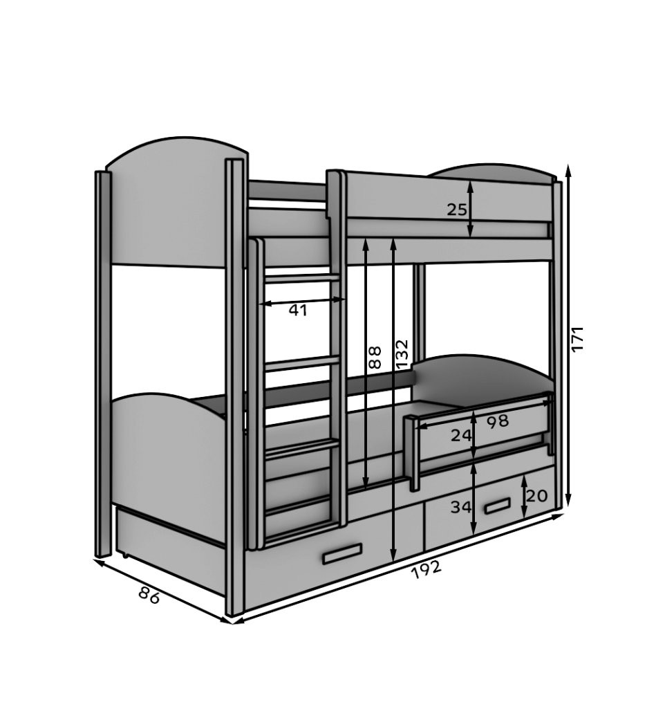 Krevet nudi udoban prostor za spavanje za dvoje djece te dodatne mogućnosti za pohranu koje pomažu održavati urednost prostora.