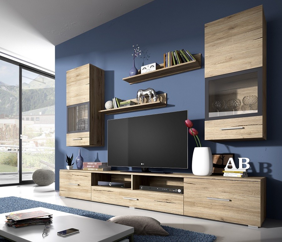 • Veliki set: regal za TV, 2x polica, 2x zidni ormarić sa staklom, 2x zidni ormarić
