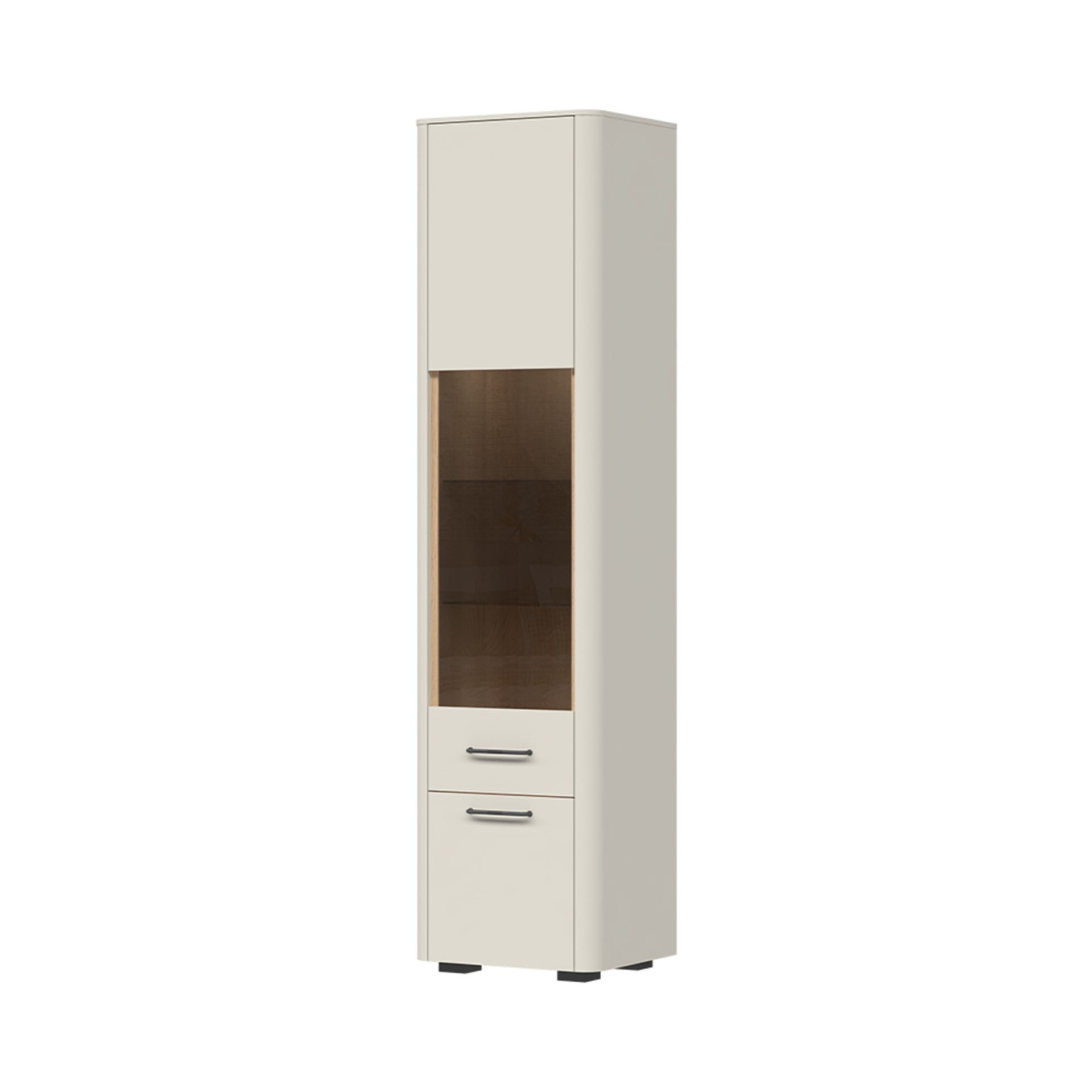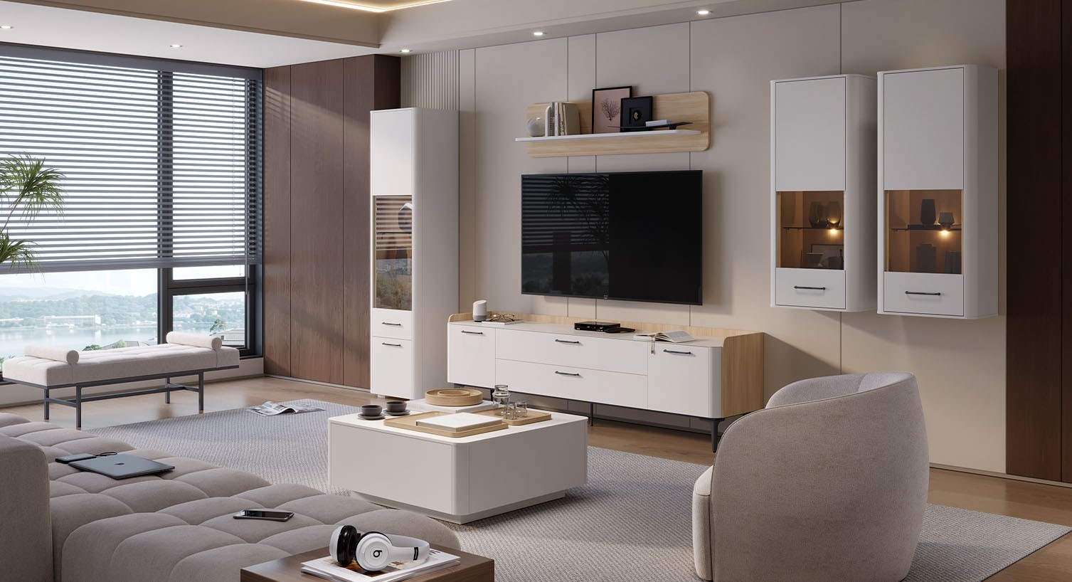 DNEVNI BORAVAK RADDA AIR 2 S LED RASVJETOM odiše lakoćom i elegancijom. Svaki element pažljivo je dizajniran i pruža savršenu ravnotežu između funkcionalnosti i dugotrajnosti. Set uključuje veliki TV ormarić, tri vitrine, prostrani klub stolić te dekorativnu viseću policu. Uključena je i LED rasvjeta, koja dodatno poboljšava izgled dnevnog boravka.