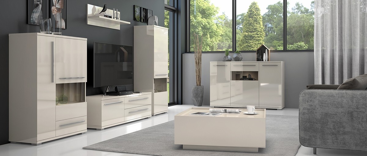 Svi artikli linije dnevnih boravka RADDA PIANO, premazani su UV lakom, koji je od ostalih lakova čak 4-puta otporniji na oštećenja i ogrebotine. UV lak omogućava namještaju visoki sjaj, koji u vaš dom donosi više svjetlosti, jer se ista odbija od namještaja te tako stvara svjetliji prostor. Topla bež boja u visokom sjaju u vaš dom donosi više elegance i moderan stil.