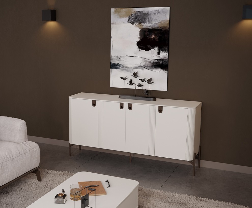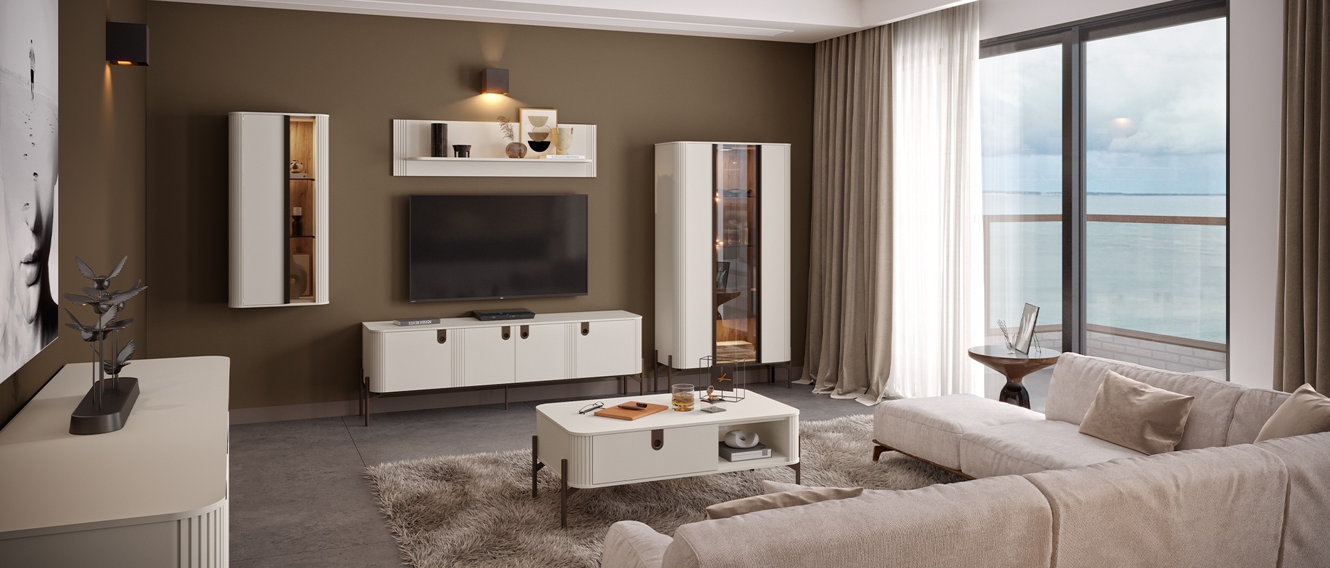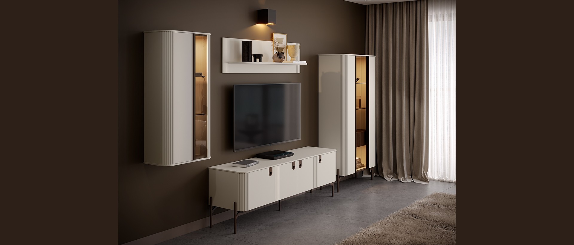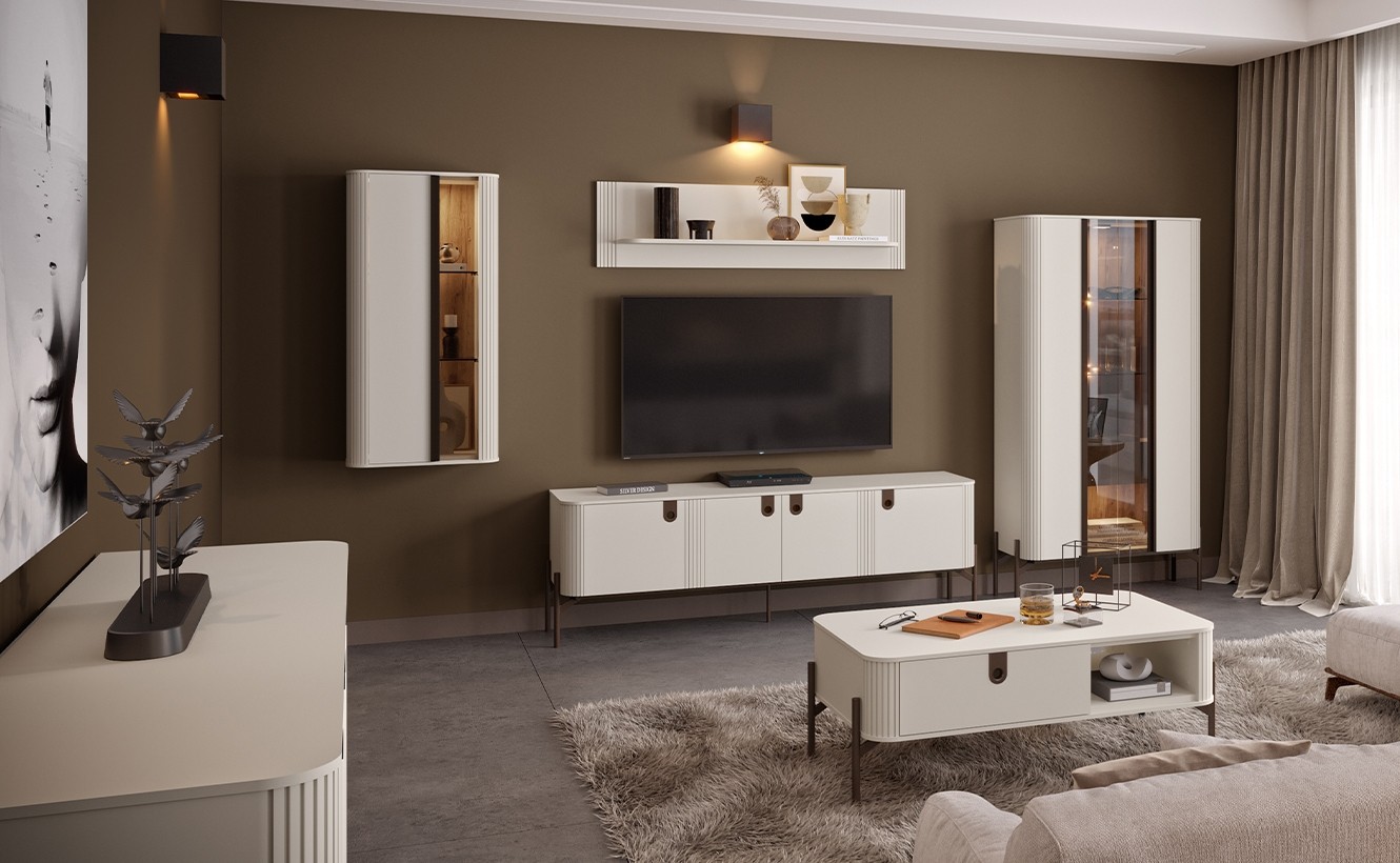 Dnevni boravak uključuje čak šest različitih elemenata namještaja koji nude obilje prostora za organizirano odlaganje. Uključeno je mekano zatvaranje koje omogućuje jednostavno svakodnevno korištenje, dok integrirana LED rasvjeta dodatno naglašava izgled dnevnog boravka.