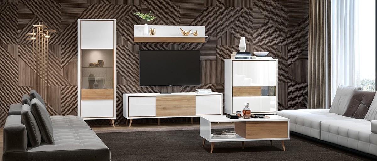 Dnevni boravak RADDA VIDA ponaša se sa izvrsnim retro izgledom, koji je bio moderan u 60. godinama. Drvene nogice stvaraju retro izgled, a visoki sjaj bijele boje, te boja pacifičkog oraha, dodaju modernu notu, koja još više uljepša vaš dnevni boravak.