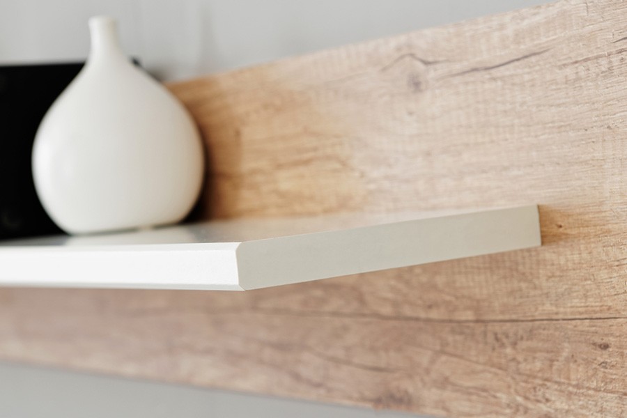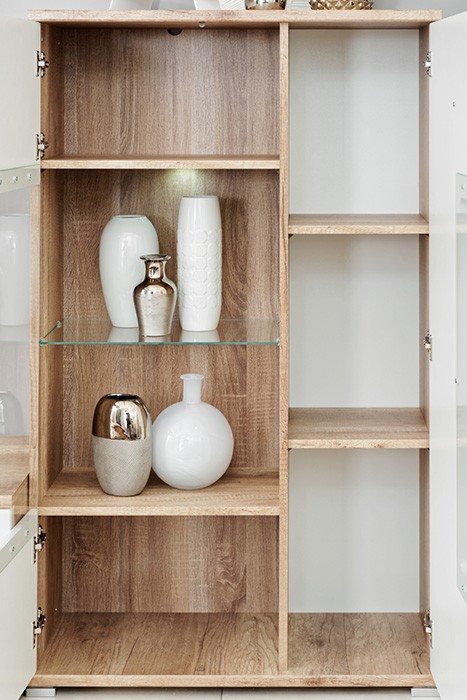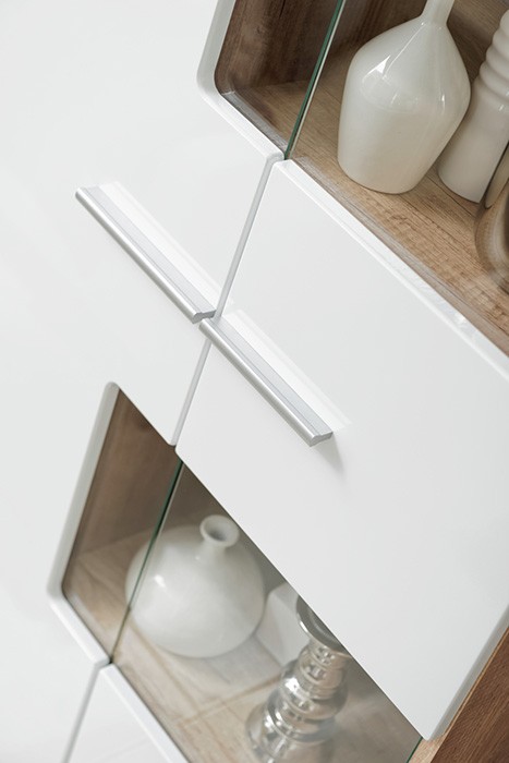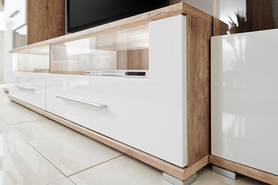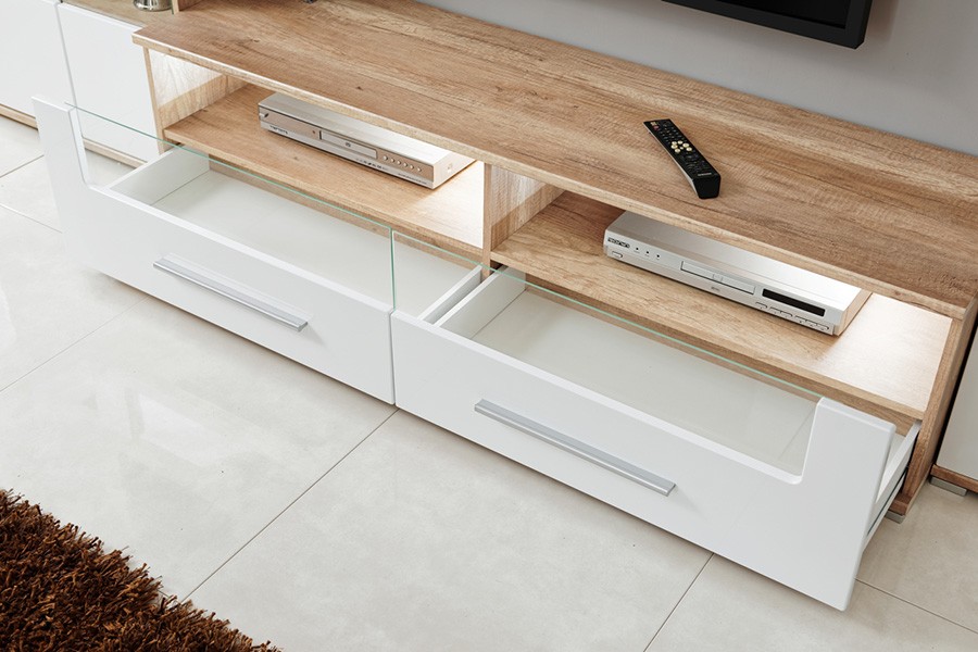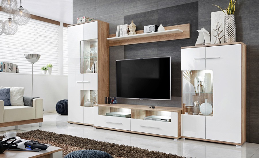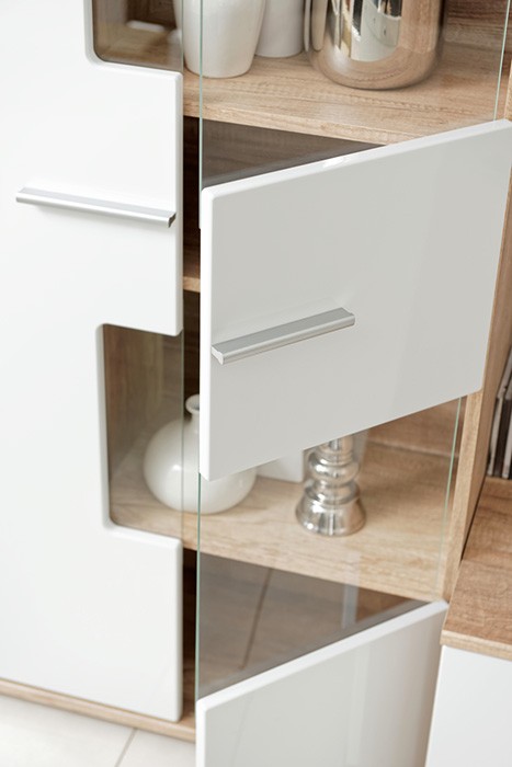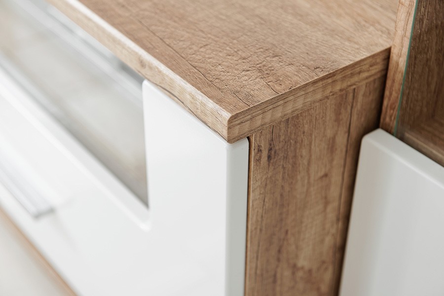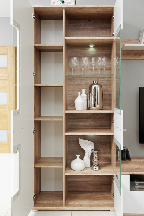 Dnevni boravak SAALA 3 je regal u kombinaciji hrasta i bijele boje. Sastavljena je iz 2 vitrine, police i TV omarice. Fronte su napravljene iz MDF materijala 16 mm, korpus je napravljen iz iverice 16 mm. Dnevni boravak je s rasvjetom.