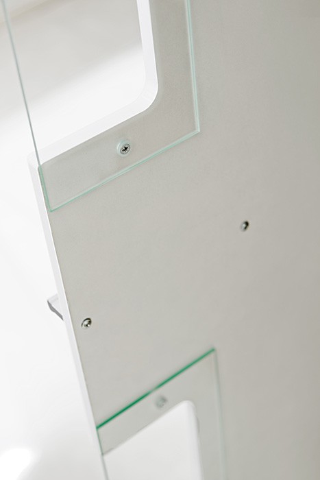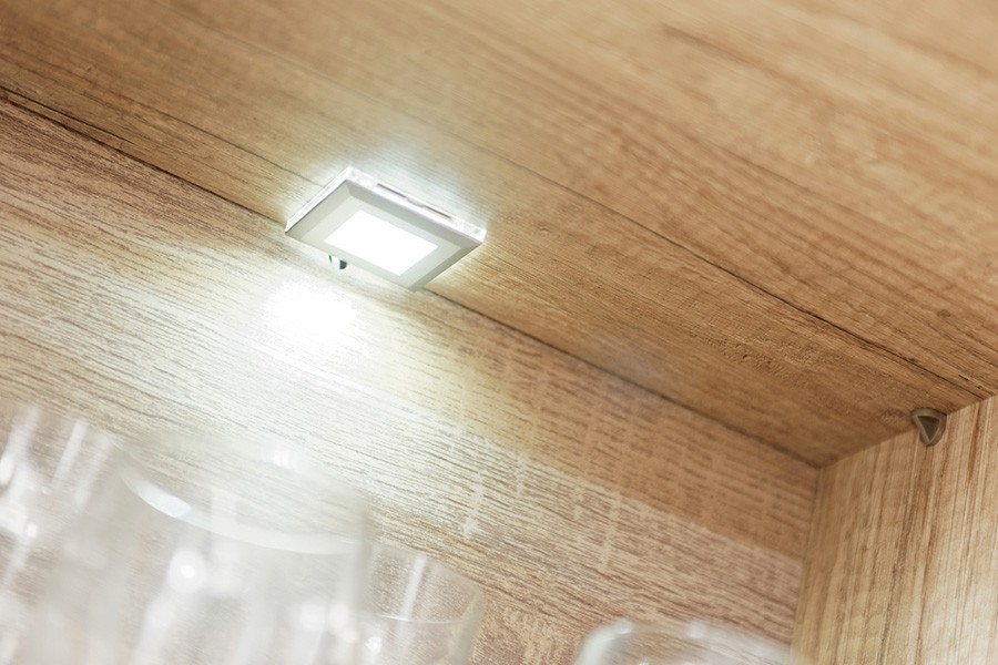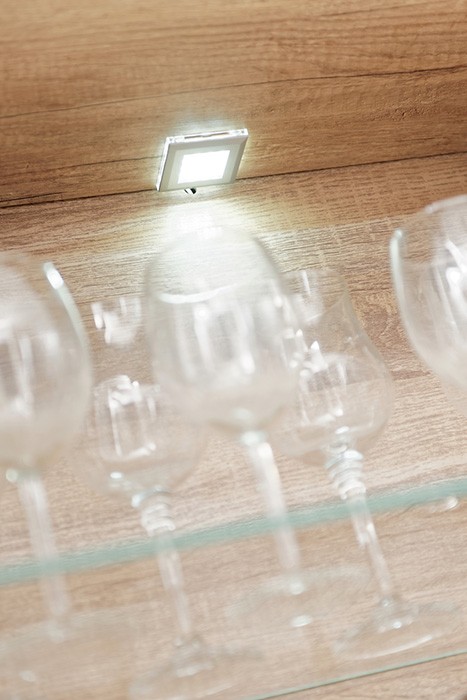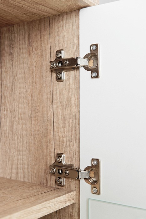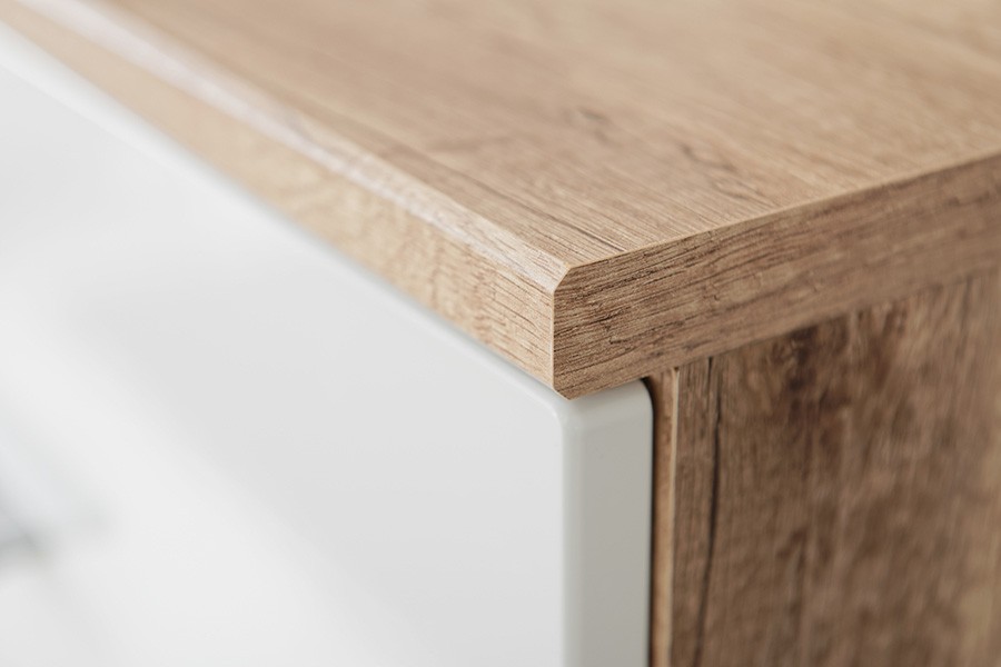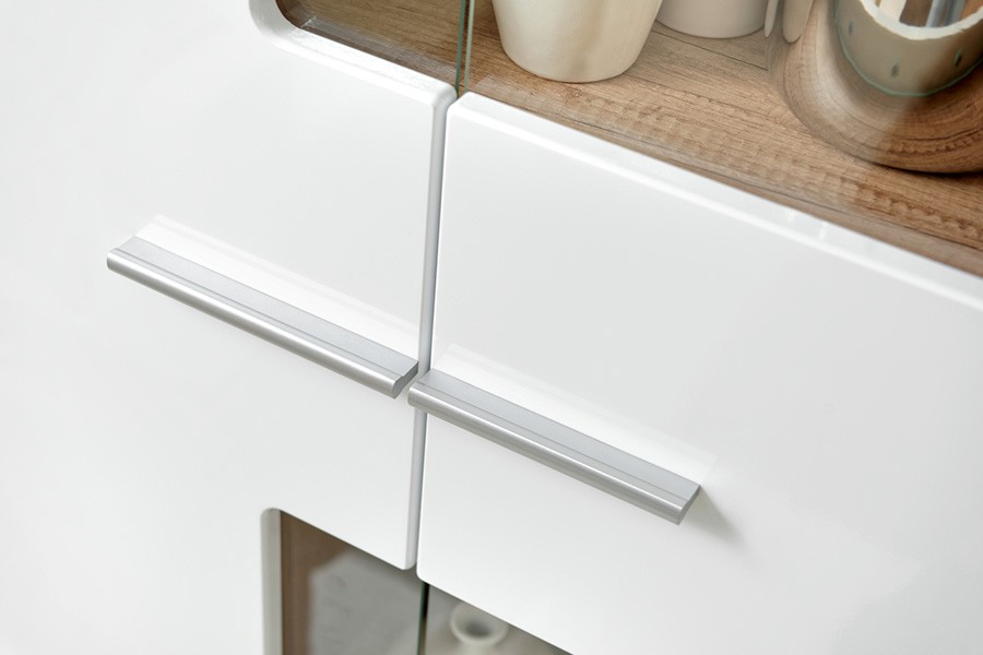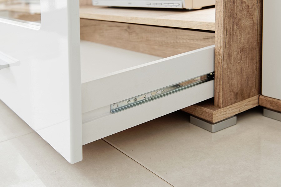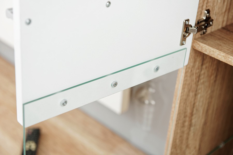Dnevni boravak SAALA 3 je regal u kombinaciji hrasta i bijele boje. Sastavljena je iz 2 vitrine, police i TV omarice. Fronte su napravljene iz MDF materijala 16 mm, korpus je napravljen iz iverice 16 mm. Dnevni boravak je s rasvjetom.