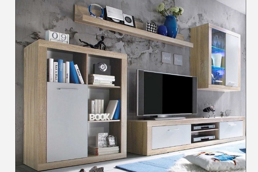 Ta kompaktan set namještaja je napravljen iz kvalitetnih materijala. Fronte so napravljene iz iverice. Set je napravljen u kombinaciji boja, bijela i sonoma hrast. Komplet uključuje vitrinu, TV stol, ormar i zidnu policu. Prodaje se samo u kompletu.