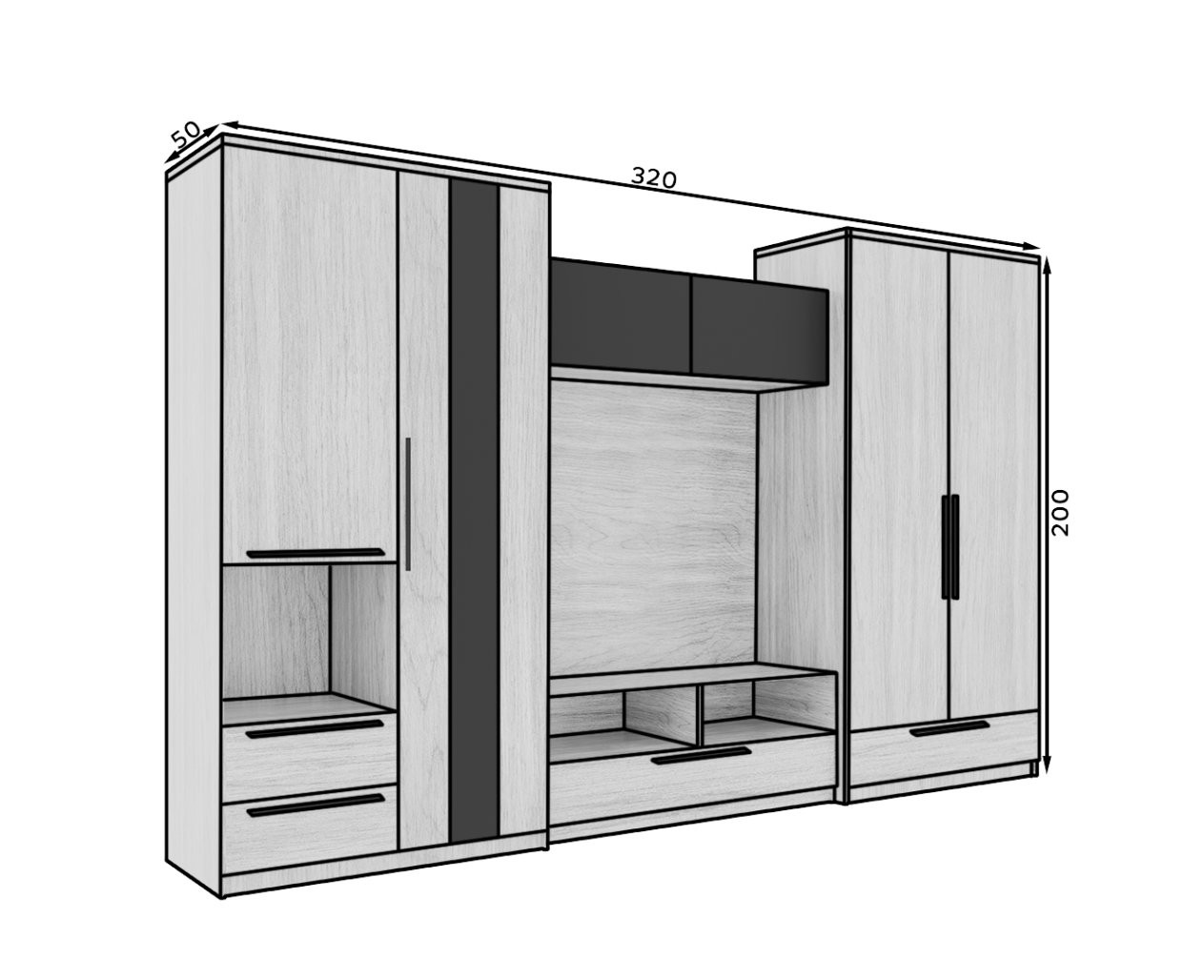 Moderna kombinacija namještaja Male u kombinaciji boja crne i artisan hrasta spaja suvremeni dizajn s funkcionalno praktičnošću. Prikladna je za različite veličine prostorija jer omogućuje optimalno iskorištavanje prostora bez vizualnog zagušenja.