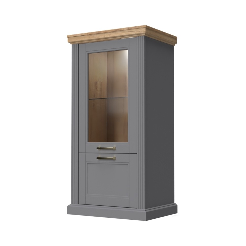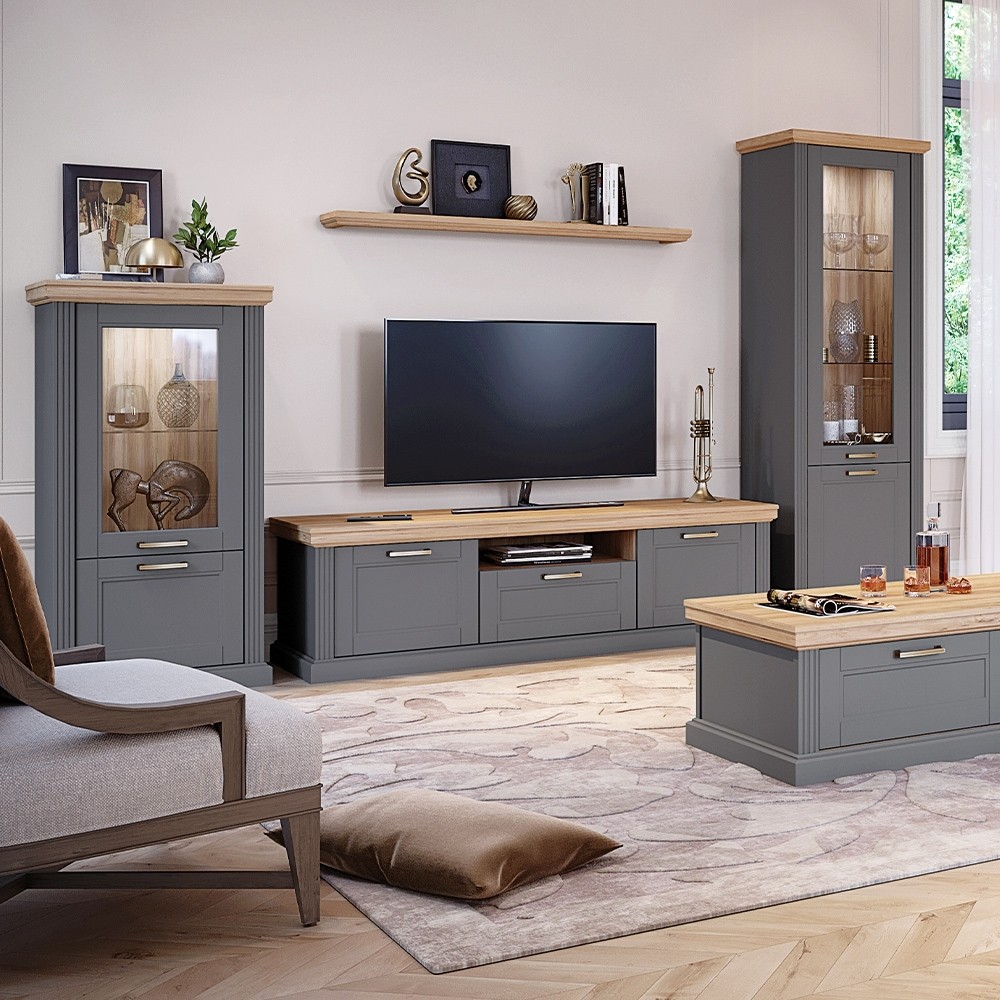 Dnevni regal Radda Tara odličan je izbor za sve koji vole toplinu drva i klasičan dizajn. Uključuje veliki TV ormarić, dvije prostrane vitrine i praktičnu zidnu policu na koju možete staviti slike i druge ukrasne predmete. Također dolazi s LED rasvjetom koja značajno poboljšava izgled cijelog dnevnog boravka. Komoda i klub stolić nisu uključeni u cijenu.