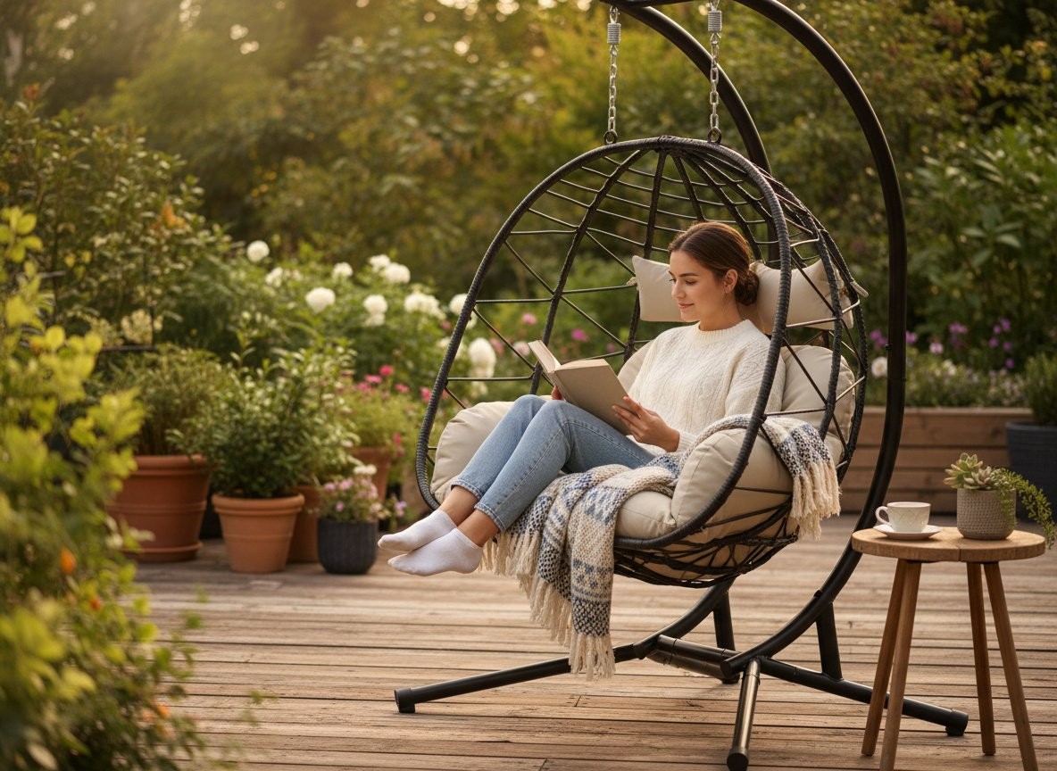 Dobro se obnese u prostorih, kao su terasa, vrt, dnevni boravak. Među navedenim dimenzijama ističu se 128 × 62 × 110 cm i 136 × 100 × 197 cm. Praktičnost dodatno naglašavaju sklopiva izvedba i uključeni jastuci.