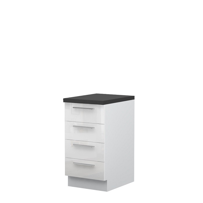 Element za kuhinju RIVA je dobavljiv u bijeloj boji visokog sjaja. Element ima uključenu radnu ploču/pult. Ručice je potrebno dodatno naručiti.