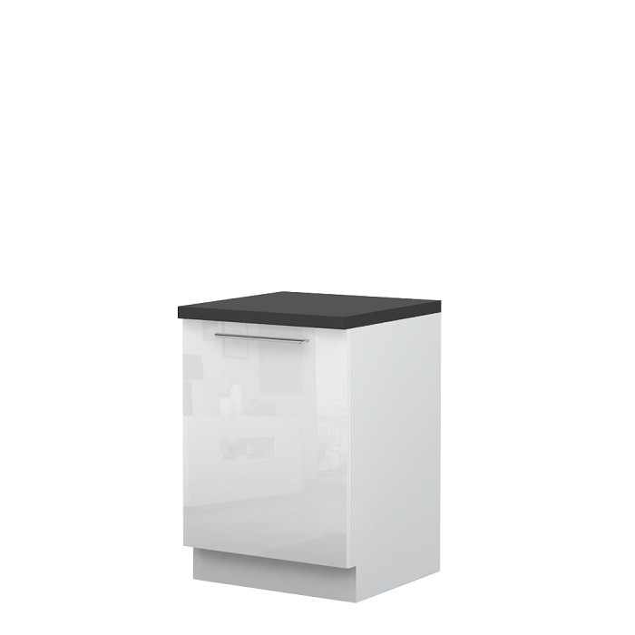 Element za kuhinju RIVA je dobavljiv u bijeloj boji visokog sjaja. Element uključuje radnu ploču/pult. Ručice je potrebno dodatno naručiti.