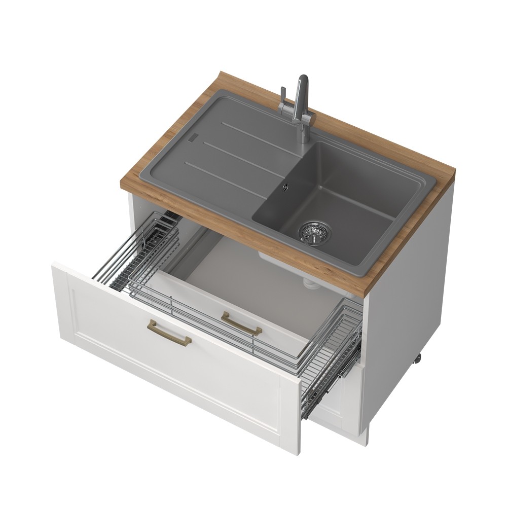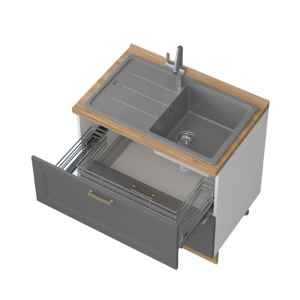 Kuhinjski element za kuhinju TARA ima jednu metalnu ladicu u koju možete ostaviti posuđe i pribor za kuhanje. . Gornja ladica ima metalnu košaru zbog koje u element možete montirati sudoper, na metalnu košaru možete odložiti deterdžent, kuhinjsku krpu i slične potrepštine. Ima funkciju tihog zatvaranja i dostupan je u dvije boje.