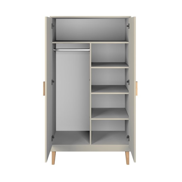 Garderobni ormar Kai praktičan je izbor za dječju ili adolescentsku sobu jer spaja preglednu pohranu i smiren skandinavski izgled. Izvedba u kašmir boji lijepo se uklapa u suvremeno uređene prostore, a oplemenjena iverica nadopunjuje cjelinu urednim i funkcionalnim izgledom.