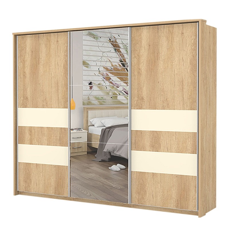 Garderobna omara Kalla Comfort z drsnimi vrati in ogledalom je nepogrešljiv element vsake spalnice, saj je izjemno prostorna. Z dodatno opremo si lahko ustvarite še bolj funkcionalno omaro, ki je prilagojena vašim potrebam. Na voljo je v barvni kombinaciji bež in nebraska hrast. Notranjost vključuje tri velike police in tri dolge palice za obešanje. Na sredini ima veliko ogledalo.