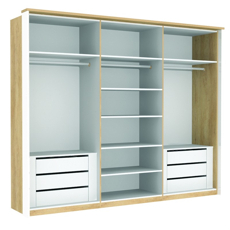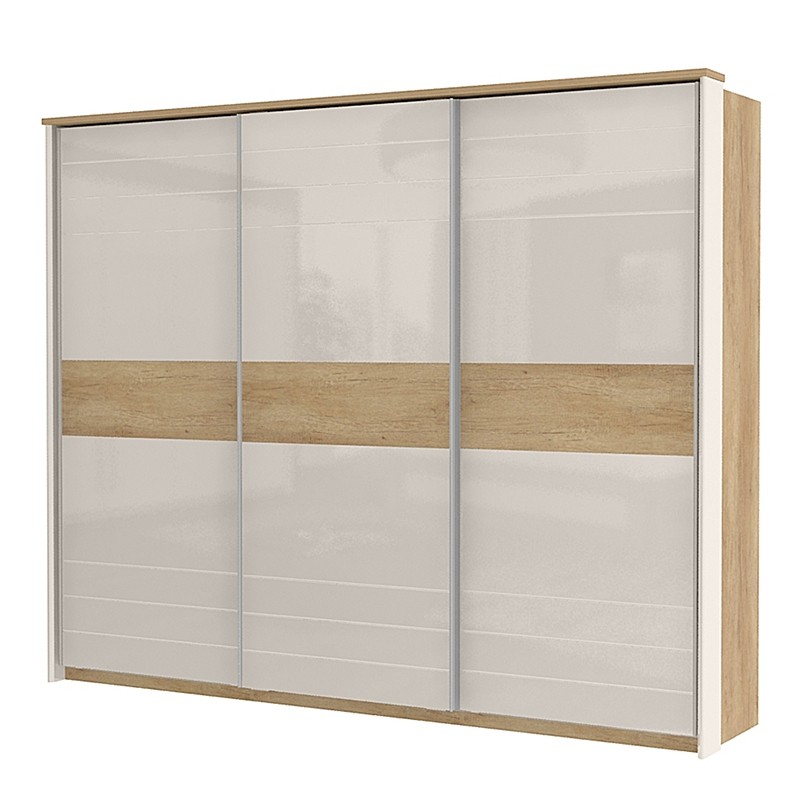 Garderobna omara Kalla Modern z drsnimi vrati je na voljo v barvni kombinaciji bež in nebraska hrast. Bež barva je v visokem sijaju, kar bo v vaš dom prineslo več svetlobe in elegance. Je izjemno funkcionalna. Z dodatno opremo si lahko ustvarite še bolj funkcionalno omaro, ki je prilagojena vašim potrebam. Notranjost vključuje tri velike police in tri dolge palice za obešanje.