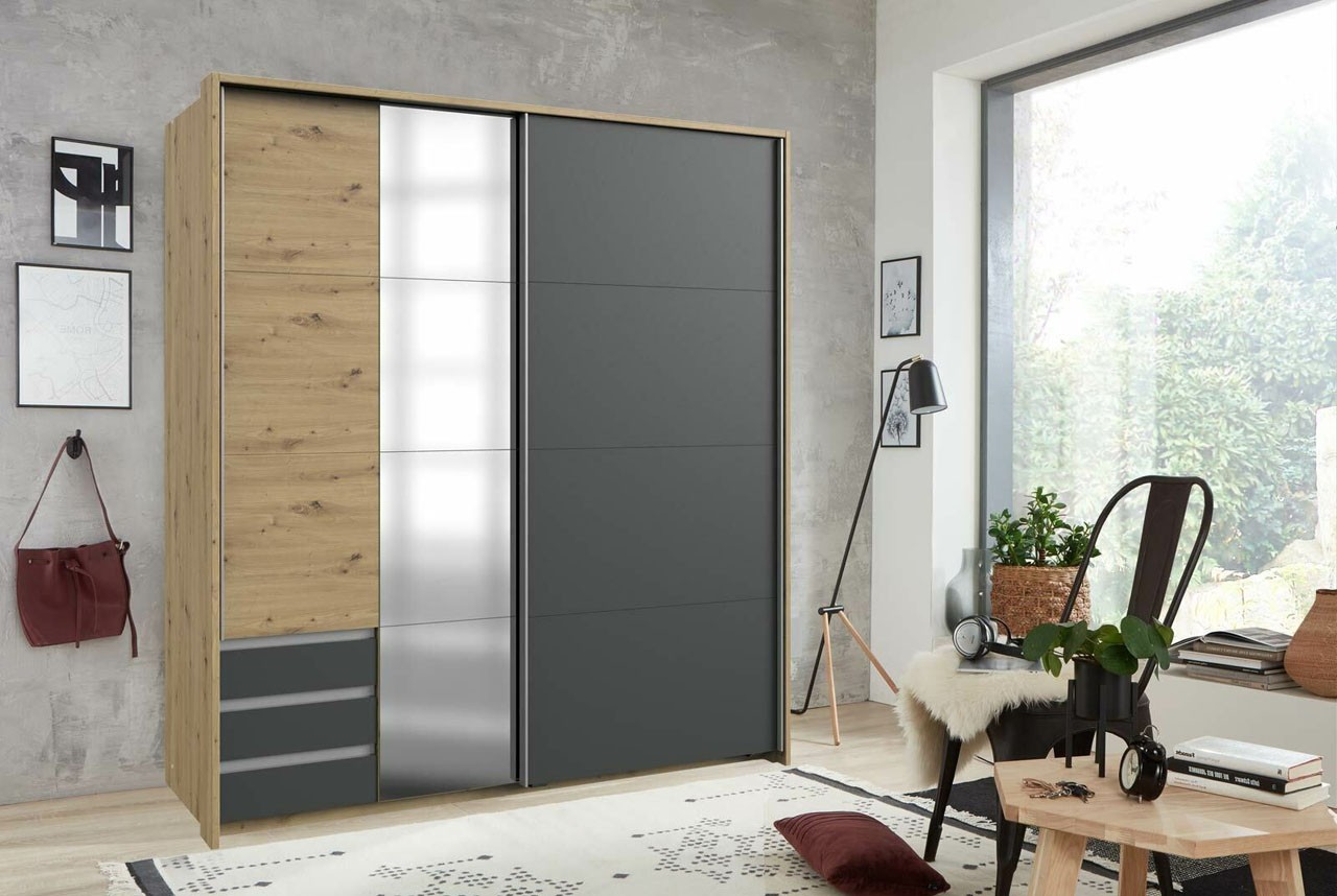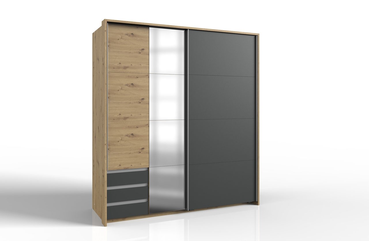 Ormar AURICH moderan je dvodijelni ormar u modernoj kombinaciji tamno sive i drveta. Ovaj veliki i nadasve funkcionalan ormar njemačkog dizajna sadrži sve što će vam trebati za savršeno uređenu spavaću sobu i pohranu sve vaše odjeće i modnih dodataka.