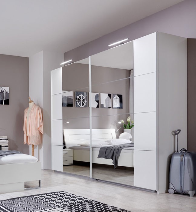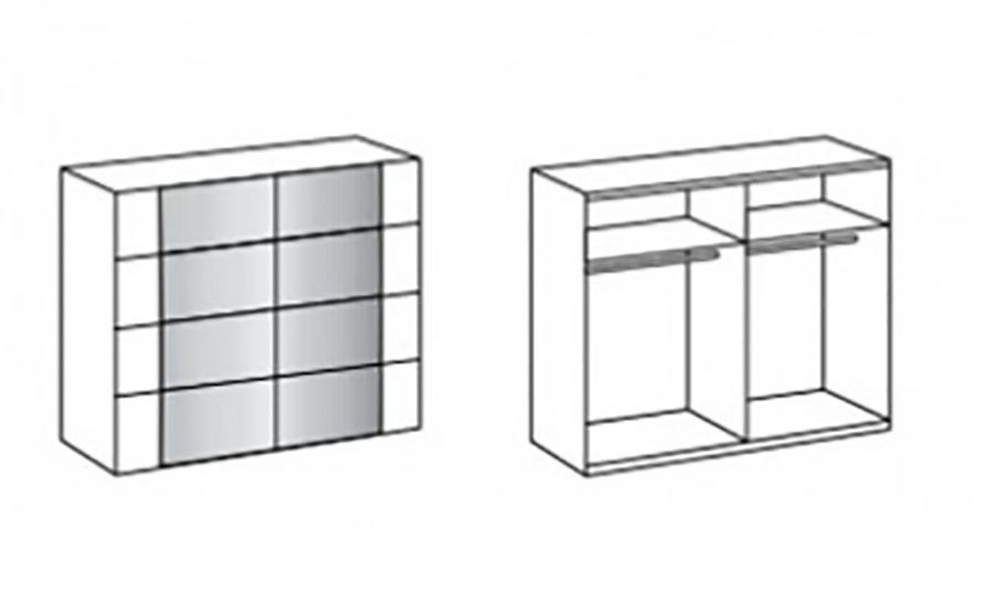 Garderobni ormar DAVOS 2D je prostoran garderobni ormar u bijeli boji s kliznim vratima. U unutrašnjosti je ormar podijeljen na dva dijela, na svaki strani je štap za vješanje i nad njim je polica. Na vratima ormara je ogledalo i nad ogledalom su dva svijetla, koje se može naručiti. Pogledajte si još ostale elemente tog programa: krevet, noćni ormarić (2 kom/set).