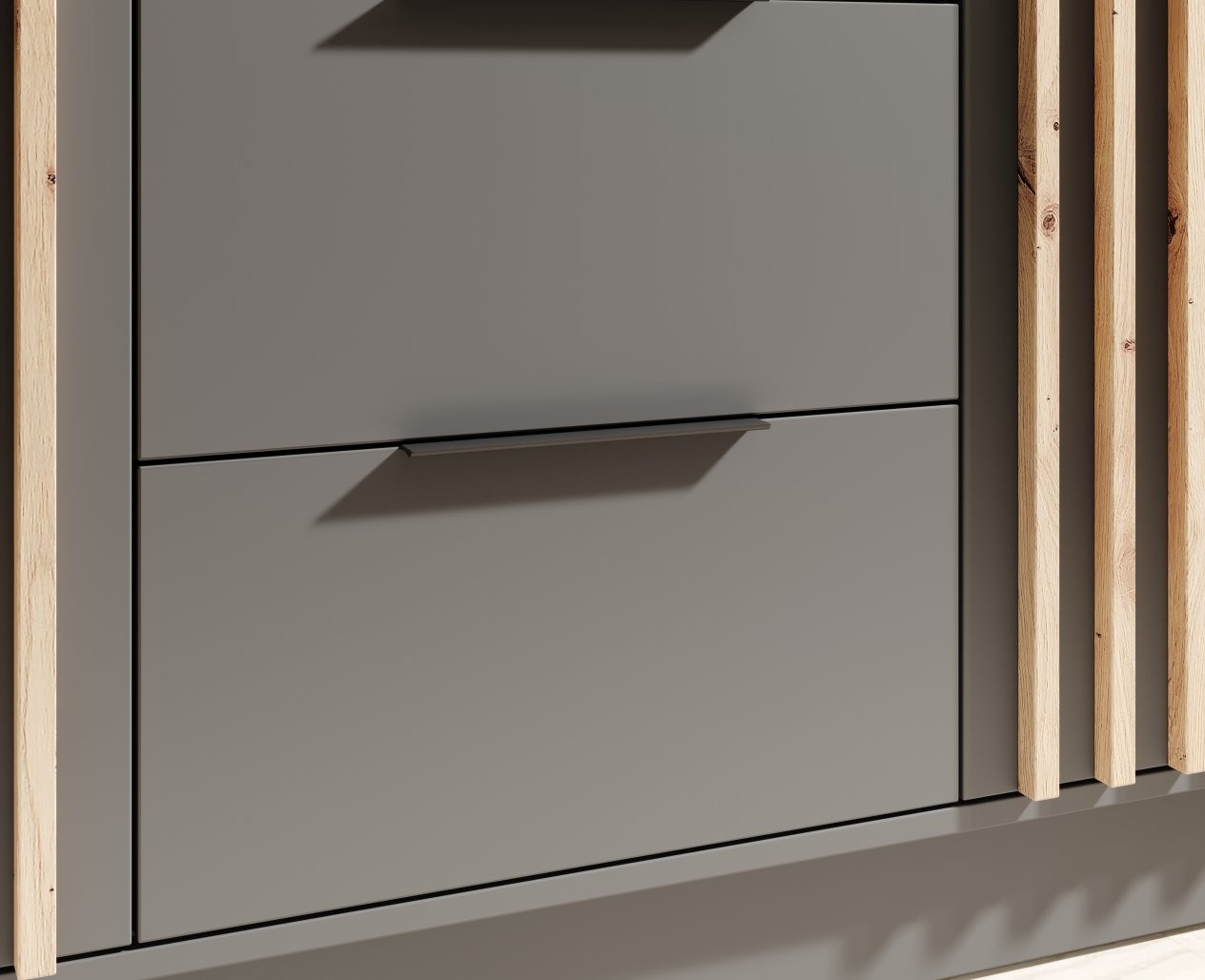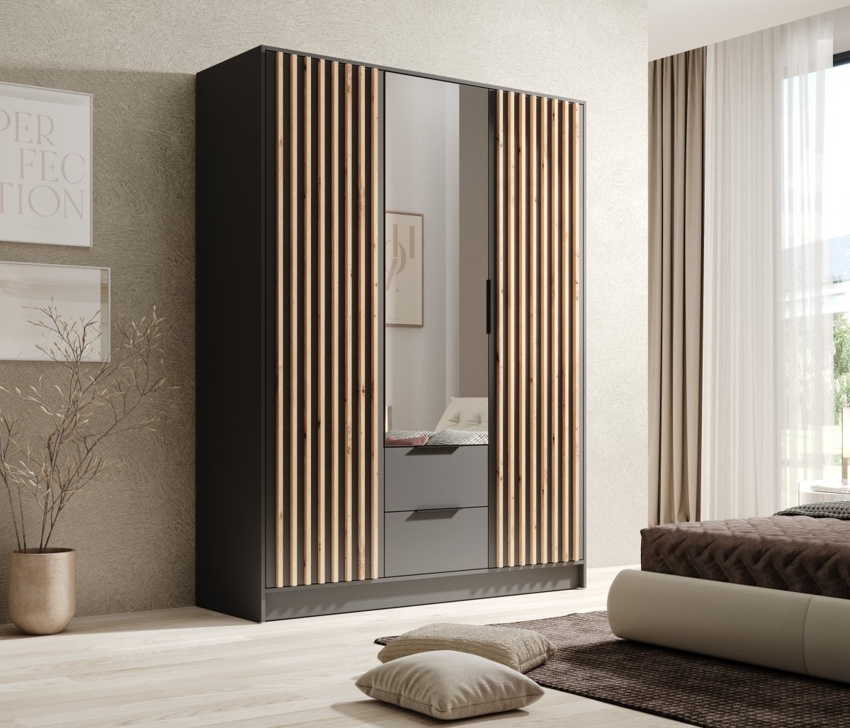 Garderobni ormar Neri s ogledalom, 150,5 cm (grafit) predstavlja elegantno i funkcionalno rješenje za pohranu, savršeno za moderne i klasične interijere. Sa svojom prostranošću i dekorativnim letvicama na prednjoj strani, obogatit će svaki prostor, dok će veliko ogledalo vizualno povećati prostor i unijeti osjećaj lakoće.