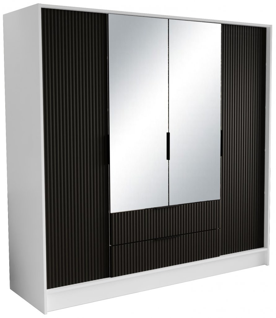Garderobni ormar s ogledalom Norel 200 cm (bijela/crna) predstavlja elegantno i suvremeno rješenje za pohranu vaše odjeće i dodataka. Valovita struktura i veliko ogledalo prostoru dodaju dubinu i funkcionalnost. Ormar je dostupan u više kombinacija boja i dimenzija, što omogućava potpunu prilagodbu vašim potrebama.