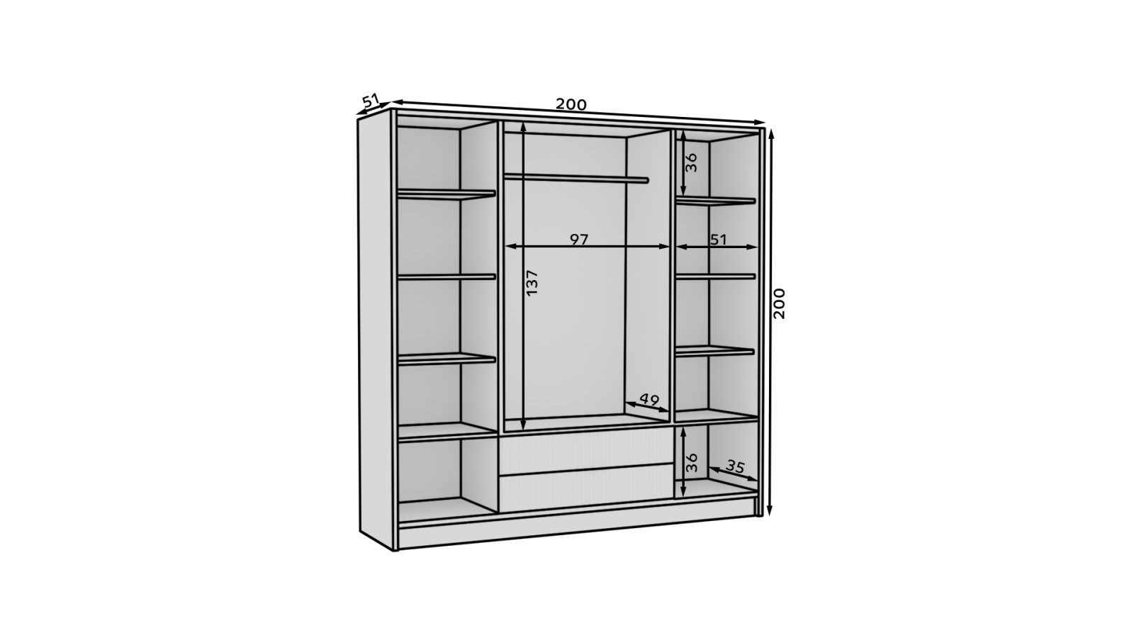 - Dimenzije: Visina 200 cm, dubina 51 cm, širine: 200 cm, 150 cm, 102 cm, 101 cm