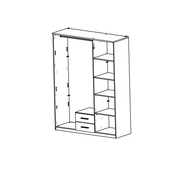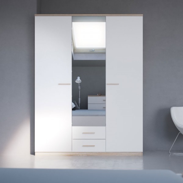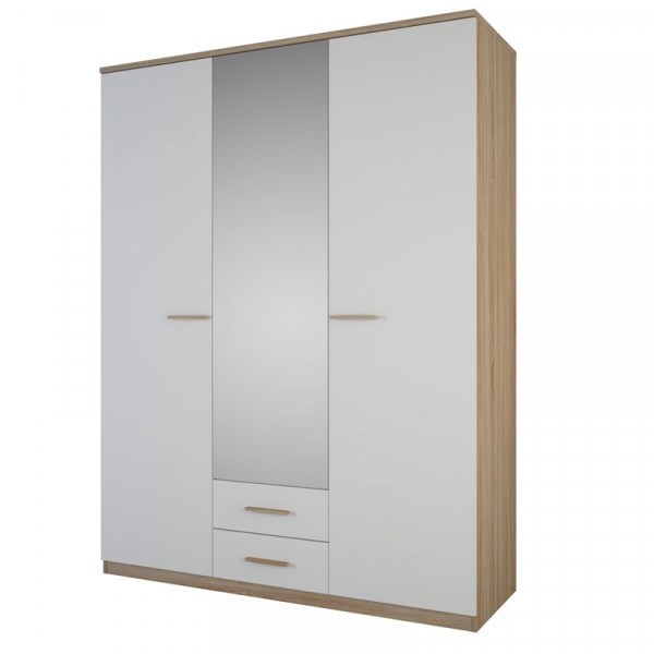 Garderobni ormar SELA je prostoran garderobni ormar, koji ima tri vrata. Garderobni ormar je u kombinaciji brušenog hrasta i bijele mat boje. Debljina unutrašnjih elemenata je 15 mm i debljina vanjskih je 22 mm. Na jednoj trećini ormara su 4 podesive police, dimenzija tog dijela je 54x50 cm. Na dvije trećine ormara je prostor za vješanje, s palicom koja je dužine 1 metar. Na sredini ormara su ispod dvije ladice za skladištenje u dimenziji 45x37x11 cm. Na srednjim vratima ima garderobni ormar ogledalo. Pogledajte si još ostale artikle iz istog programa.