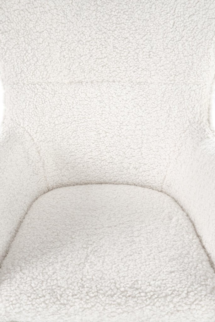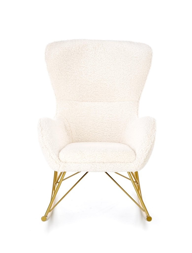 Stol za ljuljanje Jino s bouclée presvlakama u krem boji i zlatnim nogama od kromiranog čelika. Glamurozan dodatak za svaki prostor, donosi udobnost s dozom luksuza.