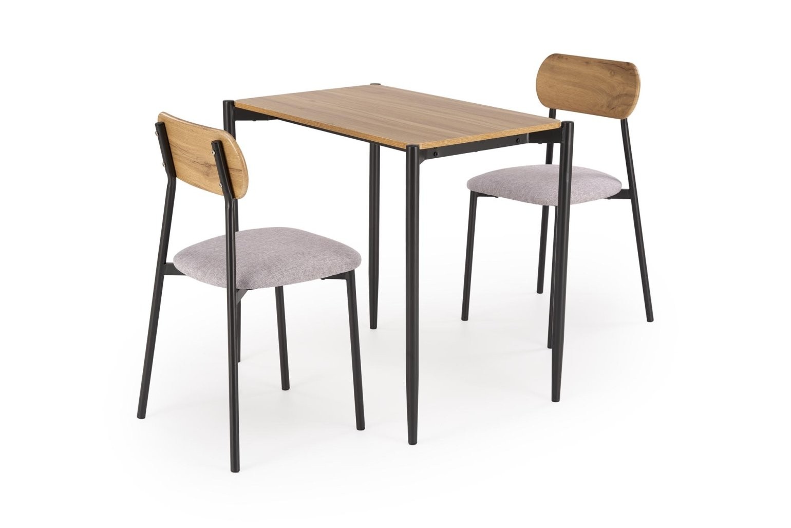 Blagovaonski set Jarrel, koji se sastoji od stola i dvije stolice, modernog dizajna s crnim metalnim okvirom i prirodnim laminiranim završetkom. Savršen za manje prostore.