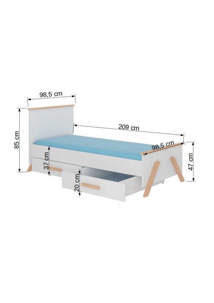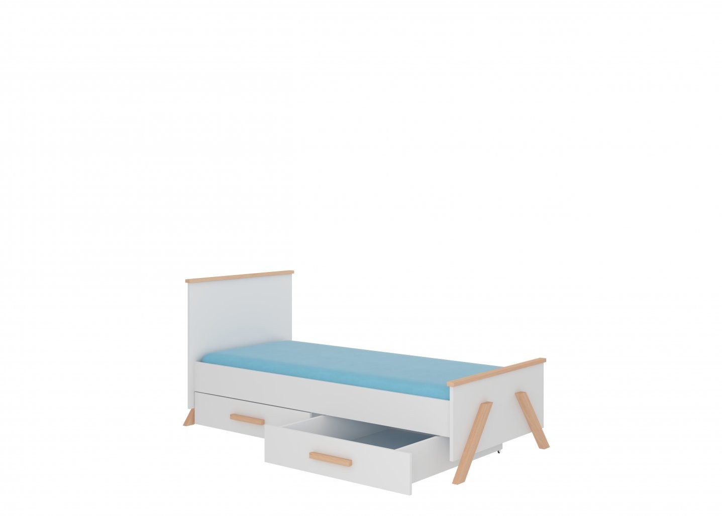 Jednokrevetni krevet KORAL 200x90 savršen je izbor za dječje i tinejdžerske sobe. Moderan dizajn u mat bijeloj boji s drvenim detaljima od prirodne bukve lako će se uklopiti u svaki interijer. Osim estetskog izgleda, nudi i praktičnost zahvaljujući dvjema prostranim ladicama za pohranu posteljine.