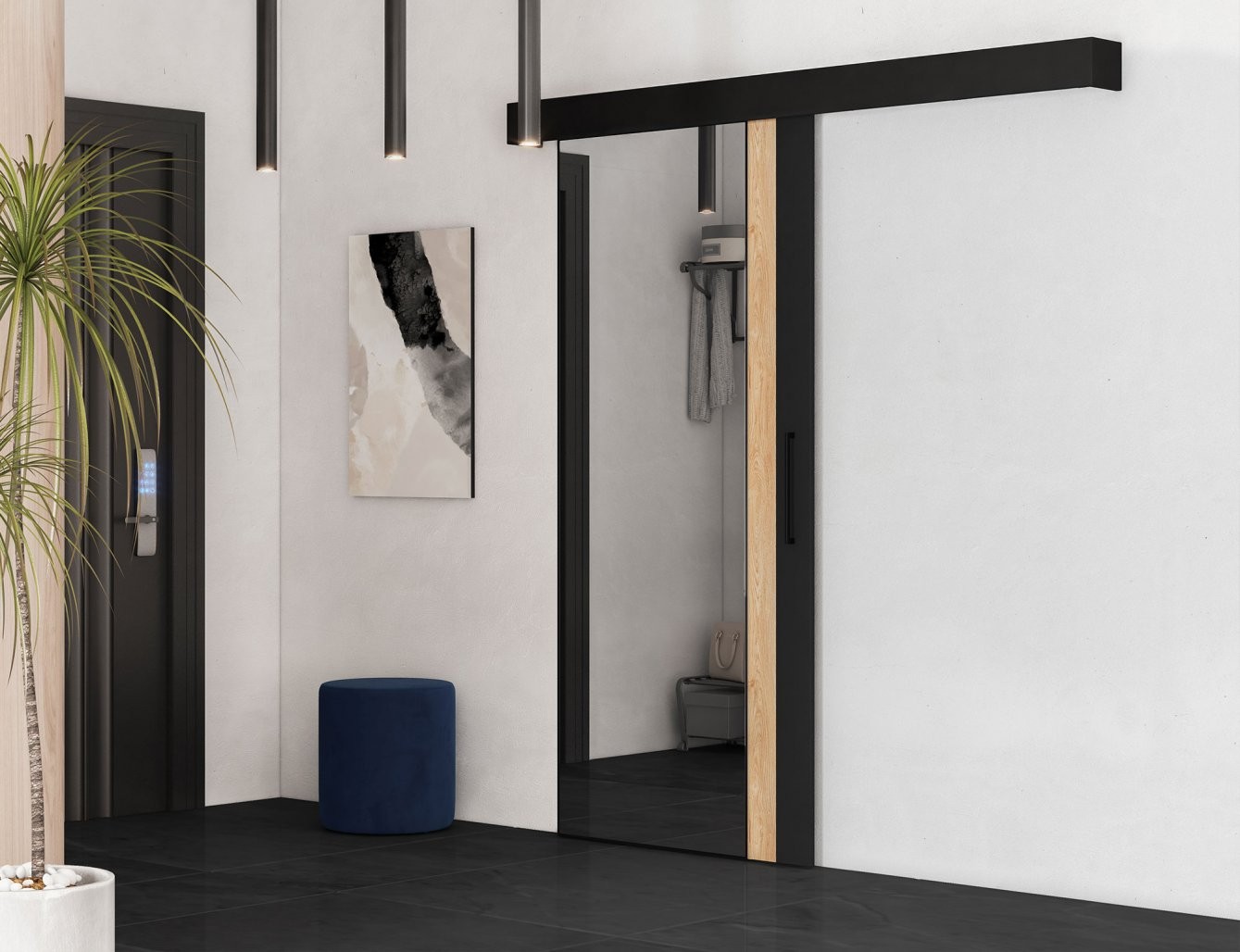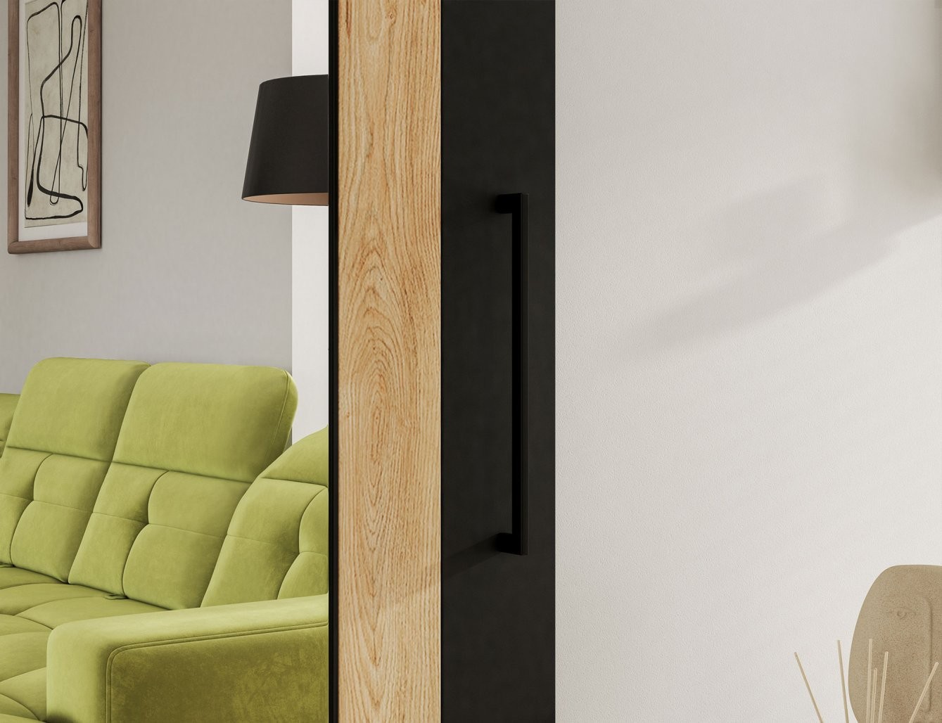 Ova su vrata izrađena od izdržljivih materijala: laminirane iverice i plastike, što jamči dug vijek trajanja. Opremljena su mekim zatvaranjem (soft-close) i sustavom Laguna S100, što omogućuje glatko i tiho pomicanje vrata. U kompletu je i elegantna crna ručka koja naglašava estetiku vrata, kao i pokrov za vodilicu koji osigurava čist izgled.