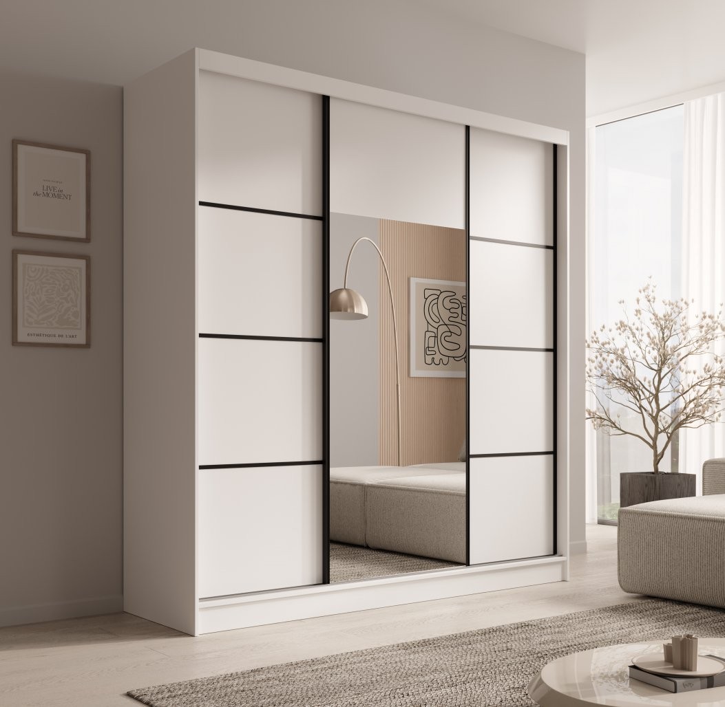 Klizni ormar Keri 200 s tri vrata i ogledalom donosi eleganciju i funkcionalnost u vaš dom – idealan za spavaće sobe, hodnike i garderobe.