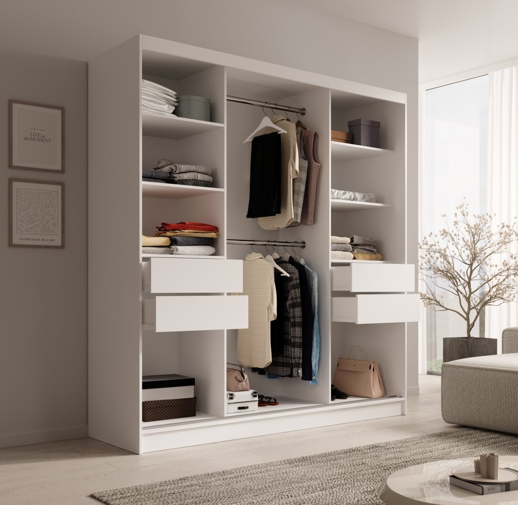 Dostupan je u različitim kombinacijama boja, što omogućuje savršeno uklapanje u svaki interijer. Ugrađeno ogledalo i brojne police čine ga idealnim za spavaće sobe, hodnike ili garderobne prostore.