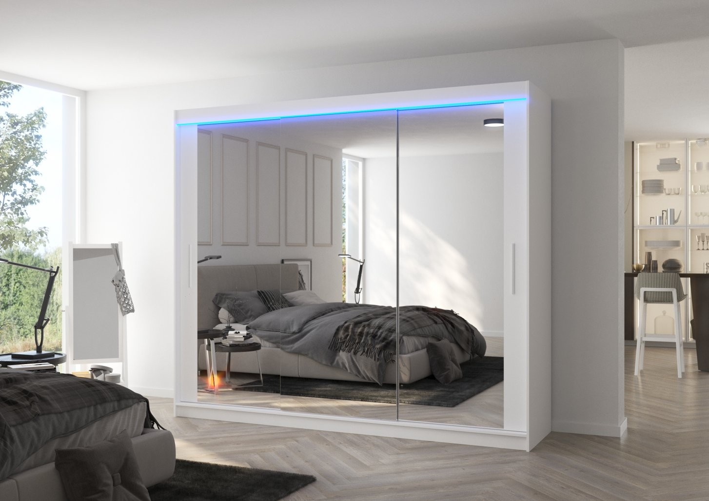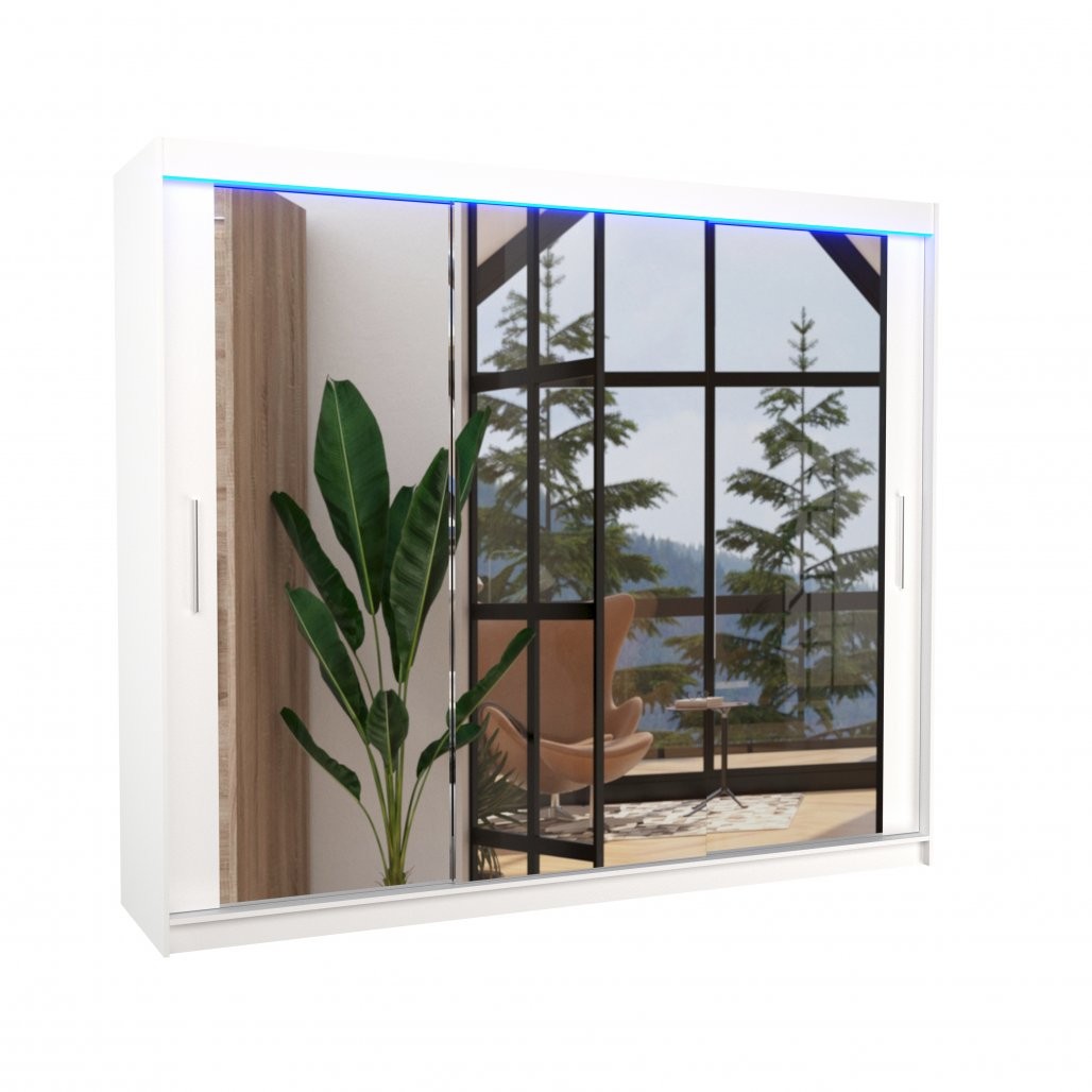 Klizni ormar s ogledalom i LED rasvjetom CHESTER 250 savršen je izbor za moderne spavaće sobe gdje su funkcionalnost i estetika ključni. Zahvaljujući kliznim vratima, idealan je za manje prostore jer ne zahtijeva dodatni prostor za otvaranje. Ogledalo na prednjoj strani vizualno povećava prostor, dok LED rasvjeta dodaje dozu elegancije.