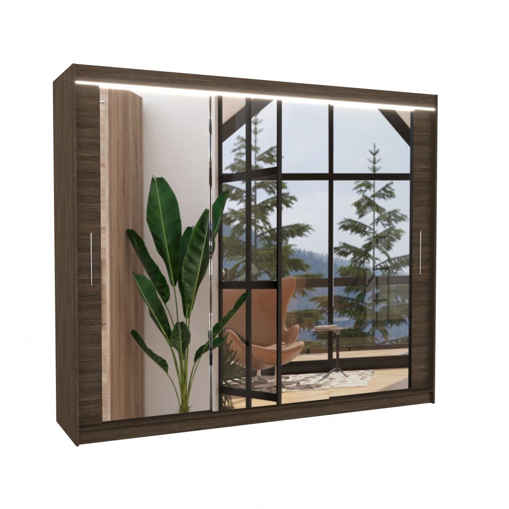 Klizni ormar s ogledalom i LED rasvjetom CHESTER 250 savršen je izbor za moderne spavaće sobe gdje su funkcionalnost i estetika ključni. Zahvaljujući kliznim vratima, idealan je za manje prostore jer ne zahtijeva dodatni prostor za otvaranje. Ogledalo na prednjoj strani vizualno povećava prostor, dok LED rasvjeta dodaje dozu elegancije.