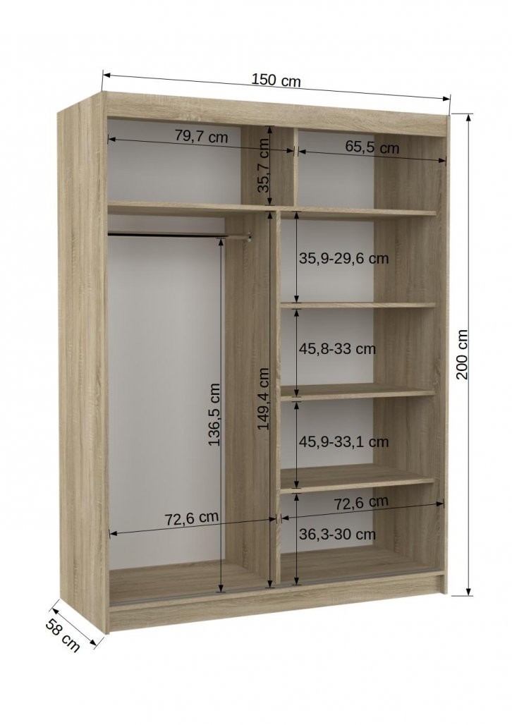 Klizni ormar s ogledalom MAX 150 cm savršeno je rješenje za svaki dom gdje želite maksimalno iskoristiti prostor i dodati dašak elegancije. Zahvaljujući kliznim vratima, idealan je za manje prostore jer ne zahtijeva dodatni prostor za otvaranje. Ugrađeno ogledalo na prednjoj strani vizualno povećava prostor i pruža dodatnu funkcionalnost.
