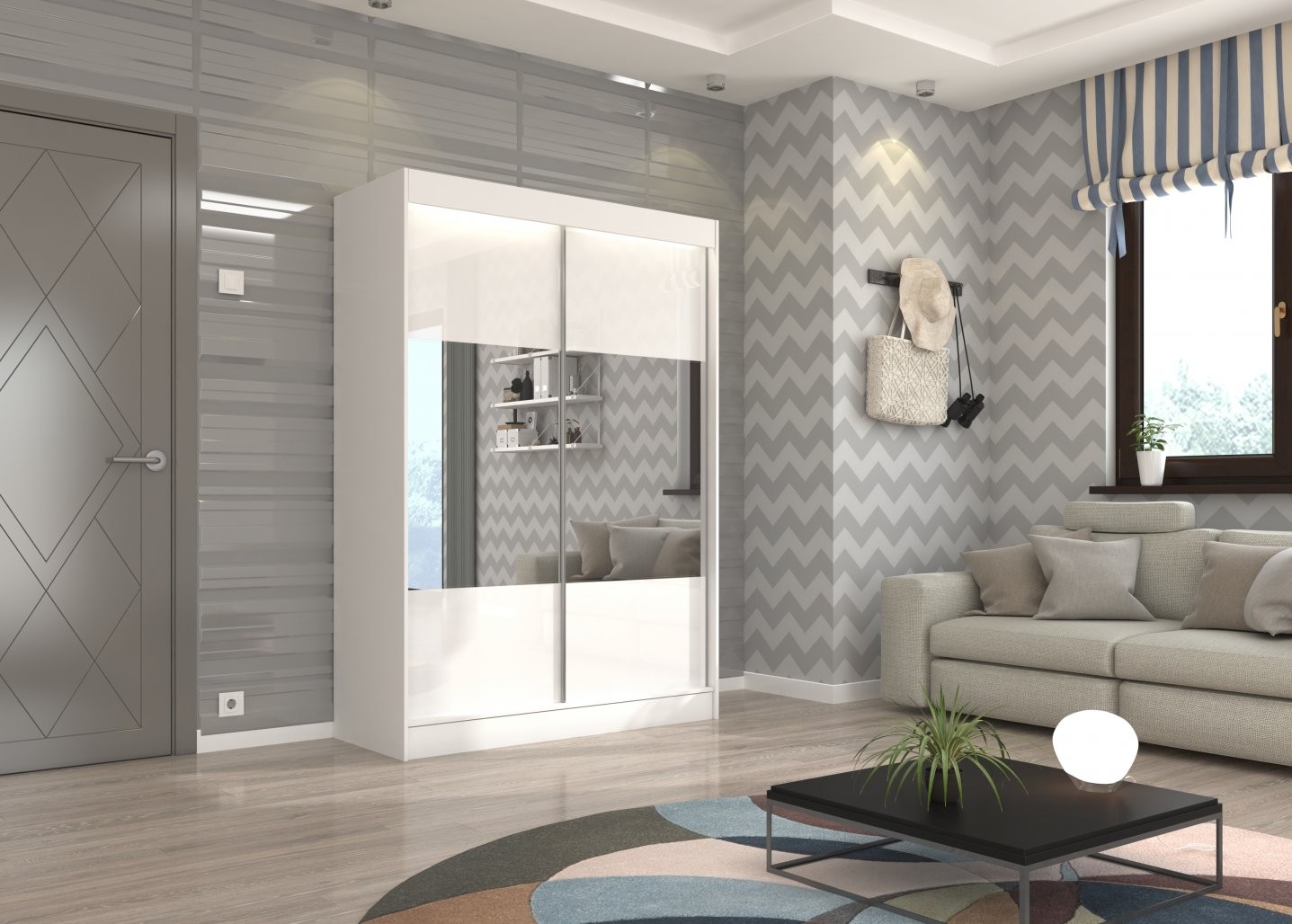 Klizni ormar TAMOS s ogledalom i staklom Lacobel 150 cm - BIJELA-LAKIRANA BIJELA, VISOKI SJAJ